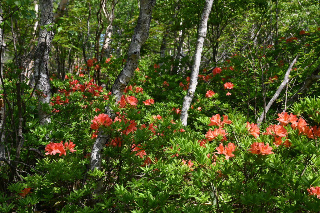 7位 レンゲツツジの群落 6月12日(2024年)に四阿山に登りました。四阿山は16年ぶりの2回目です。運動不足解消が目的でした。16年前は鳥居峠に車を置けたのですが、今回は平日だったからか、それともここから登る人が少なくなったのか、駐車場は開いていませんでした。仕方がないので、持参していた古いガイドブック見て、別の登山口のあずまや高原ホテル(2020年に閉鎖していました)まで行きました。駐車場は使うことができ、ここから四阿山に登りました。全く予測していなかったことですが、レンゲツツジが丁度ピークを迎えていて、登山道脇に咲き誇っていました。この時期に行かなければ、登山道脇にこんなに多くのレンゲツツジがあることはわかりません。ピークは長くても2週間程度だと思います。天気は晴れていましたが、夏なので空気は澄んでおらず、山頂からの景色は感動するほどではありませんでした。しかし、登山道の両脇はオレンジ色に染まっていて、なんだか得した気分になりました。