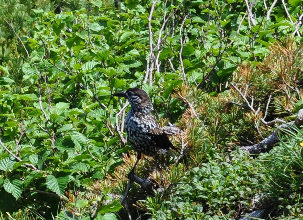 5位 ライチョウ 北アルプスと南アルプスでは時々見ることができます(北アルプスの方が多いです)。全部で10回弱見ています。塩見岳山頂では、間ノ岳を背景にしたライチョウの写真(私のお気に入り)を撮ることができました<予想しなかった山頂からの景色>。周りを見渡しているこのライチョウは南アルプスの盟主のように思えました。なお、2000mを越える高地で、人を恐れずに比較的近くに寄ってくる鳥は、ライチョウの他にはホシガラスがいます(下の2枚目の写真)。ライチョウよりも遭遇する確率が高いです。