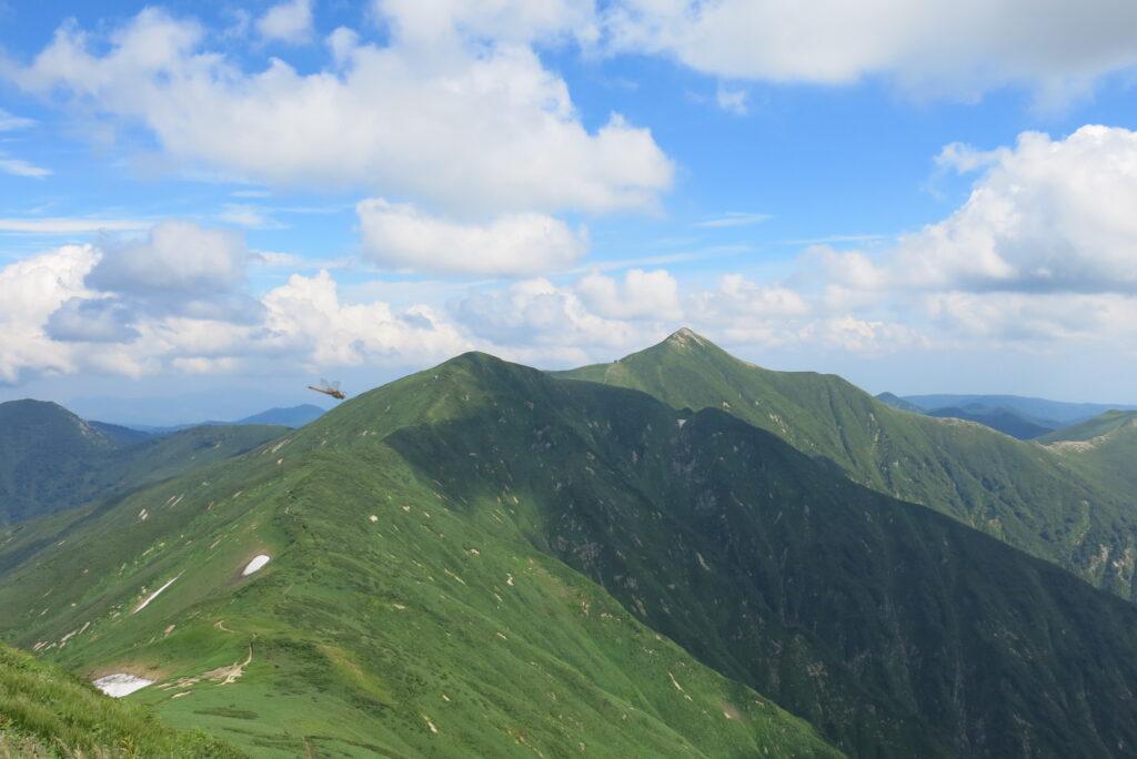 3.朝日連峰 泡滝ダムから朝日鉱泉まで、以東小屋、大朝日小屋を使って、2泊3日で縦走しました。遠くから大朝日岳を眺めて、だんだんと近づいて行くコースで、達成感があります。大朝日岳へは朝日鉱泉や古寺鉱泉から大朝日岳小屋利用の一泊二日で登られる方が多いようですが、もう一泊して縦走することをお奨めします(車利用では難しいですが)。私が登ったのは8月でしたが、機会があれば、10月初めの紅葉の季節に再度訪れたいと思っています。紅葉がとても美しいようです。(写真は縦走路上の西朝日岳より朝日岳を望む)