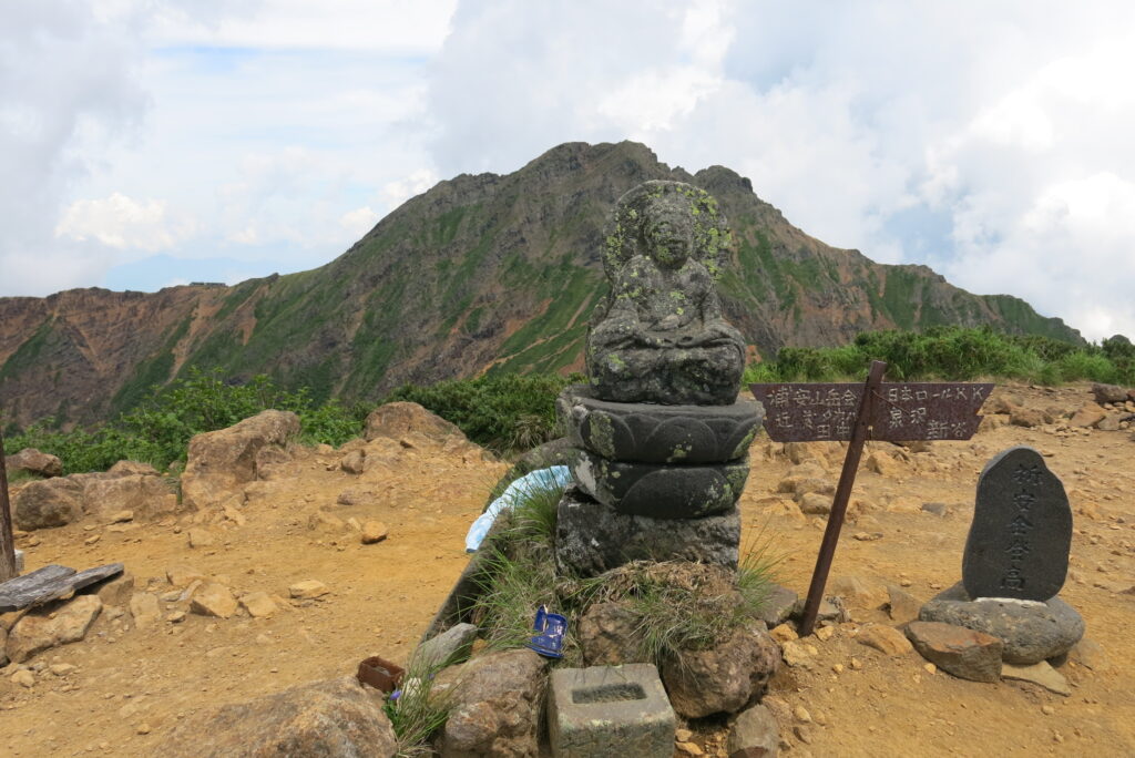 飯豊連峰の梶川尾根の五郎清水:7月の暑い日でした。石転び沢の大雪渓を上る予定でしたが、直前にアイゼンがないと危ないとの情報を得て、梶川尾根に変更しました。持っていた地図には湯沢峰辺りに1つと梶川峰手前の五郎清水の計2か所に水場があると表示されていたので、持ち水の500mlを捨てました。これが間違っていて、湯沢峰辺りの水場を見過ごし(水場はなくなっていたのかもしれません)、水が足りなくなってしまいました。すれ違った外国人の方に、五郎清水で汲んだという水を譲ってもらい(登山者としては決して褒められることではありません)、なんとか五郎清水まで辿り着き、事なきを得ました。水を譲ってもらえなければ、途中で引き返していたと思います(写真:梶川尾根から望む飯豊連峰、五郎清水の標識)。<東北の夏の日本百名山は暑い>