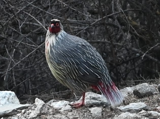 4月28日 ルザ Luza 4360m のロッジ Khangtega View にて(本日の歩行時間約5時間): ポルツェ・テンガ 3680mは谷底に位置するので景色は良くないが(低地なので体に良いと思い宿泊地に選んだ)、日が昇ってきて窓の外を見ると、昨日は霞んでいたタムセルク6608m(写真、この山はナムチェからも見えます)の山頂辺りがくっきりと見える。朝だからなのか、今日は空気が澄んでいるのかどちらかはわからない。道の方を見ると、キジのような鳥のつがいがいる。ネパールの国鳥のダフェであった。雄(写真)は色鮮やかで、雌は地味。その後ダフェは、帰りにドーレの林で見かけたのと、帰りにこのロッジ周辺で見た(今日のと同じ個体かどうか不明)。しかし、クムジュンでは見ることができなかった。ネパールの国花のシャクナゲがあちこちで咲いていたが、ダフェの方が希少価値は高い。ここに泊まって良かった。