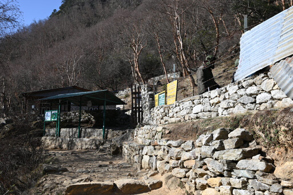 ロッジを7時15分に出て、30分ほどでチェックポイント(写真)があった。トレッキングカードと入場許可証の両方を見せた。なんと鉄条網越しに、ノートに手書きで写された。30分毎くらいに休憩を入れながら400mの急坂を登り切った。高度と老齢と重い荷物のせいで息が切れる。昨日ポルツェ・テンガ に泊まらずにドーレまで歩いていたら、相当苦労しただろう。エベレスト街道は人が多かったが、分岐点からはまばらにしか人は通らない。動物の隊列もほぼ皆無である。このコースは静かなトレッキングを好む人に向いている。10時前にドーレ 4084mに到着。高度順応のためにドーレに泊まろうと思っていたが、あまりにも時間が早いので、先に進むことにした。ミルクテーを頼んだヒマラヤンロッジ(だったと思う)の愛想のいい女将(この女将は帰り道でも登場します)から、マッチェルモまでゆっくり行っても3時間で着けるとの情報を得た。