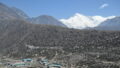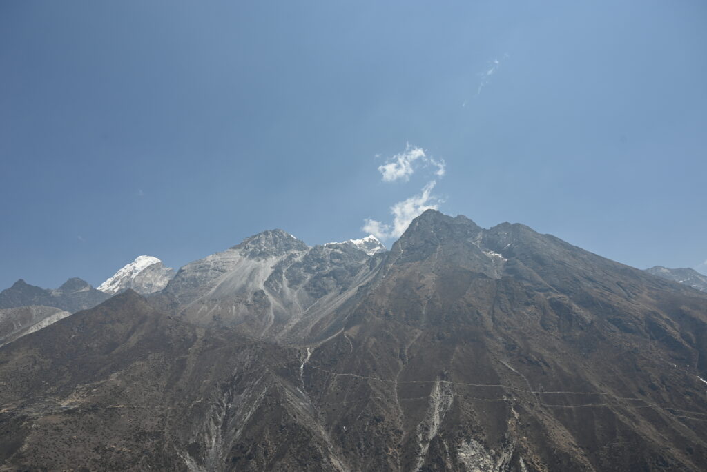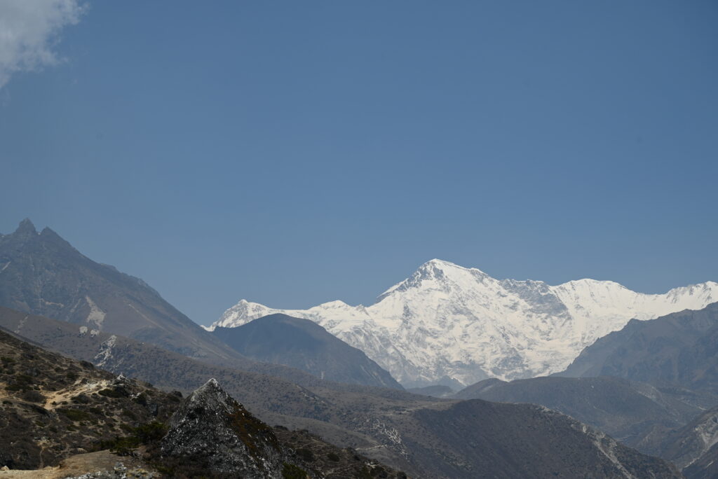 ドーレを辺りが森林限界のようで、以降は木々少なくなる。4月末なのでまだ緑が少なく、荒涼としている。ヤクは散見されるが、新しく生えてきた草をすかさず食べつくしている感がある。ドーレではヤクの牛乳を縛っているとのこと。不確かであるが、エベレスト地域のロッジのミルクティーはヤクの生乳を使っているようで美味しい。今回のトレッキングではレモンティーはほとんど注文せず、ミルクティーばかり飲んでいた。アンナプルナ地域では粉ミルクを使っているところが多かったと思われる。今日は特に北方面は空気が澄んでいて、チョー・オユー8188m(シェルパ語でトルコ石の女神)が良く見える(下の1枚目の写真)。南のタムセルク6608mとカンテガ6779m(いずれもナムチェから見えていました)はやや霞んでいる(2枚目)。空気の温度が低い北側は澄んでいるのであろう(と勝手に推測)。東側には川(ドゥードゥー・コシ)の対岸に道が見える(3枚目)。西側近くに、雪はあまり載せていないが、尖った山が見える(4枚目)。四方にヒマラヤの山々が見える絶景のトレッキング。この先、ゴーキョまではこのような景色が続いた。