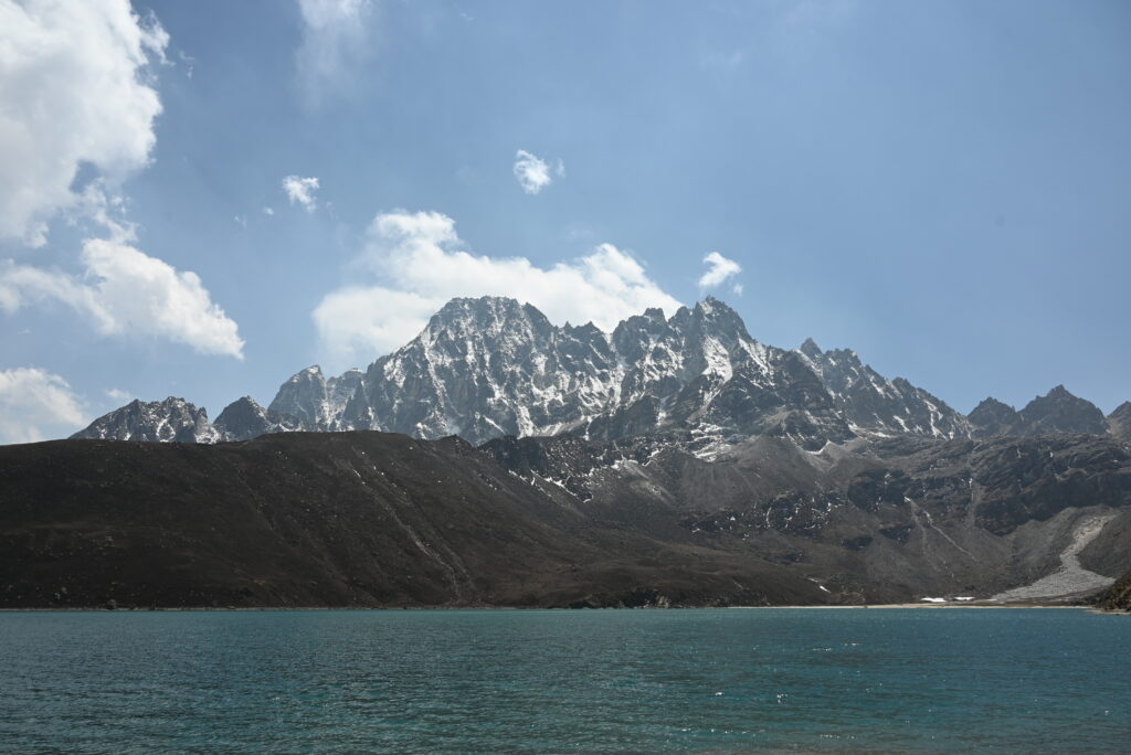 ゴーキョに近づくと谷が浅くなり、これまでは谷底を流れていた川が近くなり、左手に湖が現れた。最初のは湖と言えないほど小さい。2つ目と3つ目はそれなりの大きさがあり、日本では見たことがないような深い青色の水をたたえている。特に3つ目の湖ドゥードゥ・ポカリには、対岸に切り立った山が鎮座していて、湖の神秘性を増している。