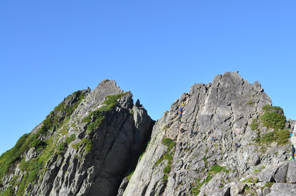 剱岳 一般的な南のコースから2回登りましたが、日本百名山の中で最も滑落の恐怖を感じるのは剱岳です。年齢を重ねるにつれ、高所恐怖症が増してきて、現在は登山時のことを思い出す度に怖さを感じて震えています(少し盛り気味に書いています)。写真は剱岳の難所の一つ、平蔵のコルです。よく見ると、驚くべきことに右側の岩壁を人が登っています。ここは一般的な登山ルートですが、落ちたら大怪我は間違いありません。このような難所が至る所にあり、前剱より奥では生きた心地がしませんでした(こちらの表現は率直な感想です)。