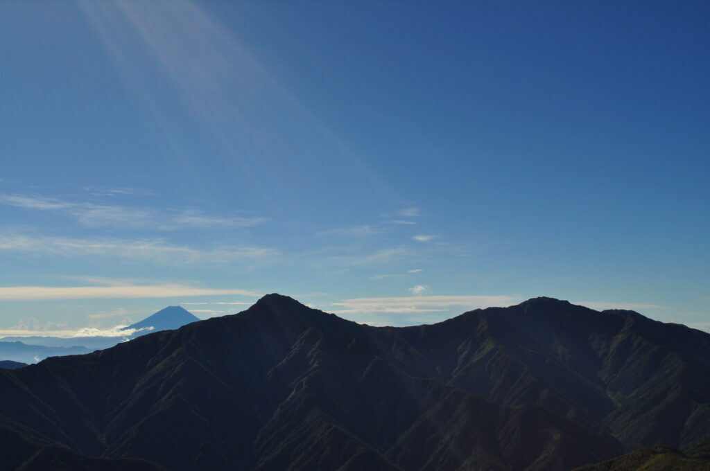 富士山 景色があまり変わらない単調な上り道を、多くの観光客の渋滞の中で登る気力はありません。私は静かな山行が好きです。山小屋もとても混んでいるようです。また、マナーの悪い外国人登山者が増えているとも聞いています。余談ですが、混んでいないという理由で、エベレストのトレッキングではゴーキョ・コースを選びました(ネパールトレッキング5-1)。富士山は登るより遠くから見た方がよいと思います(個人の意見です)。写真は北アルプスの涸沢岳と北穂高岳の間から前穂高越しに見た富士山です。