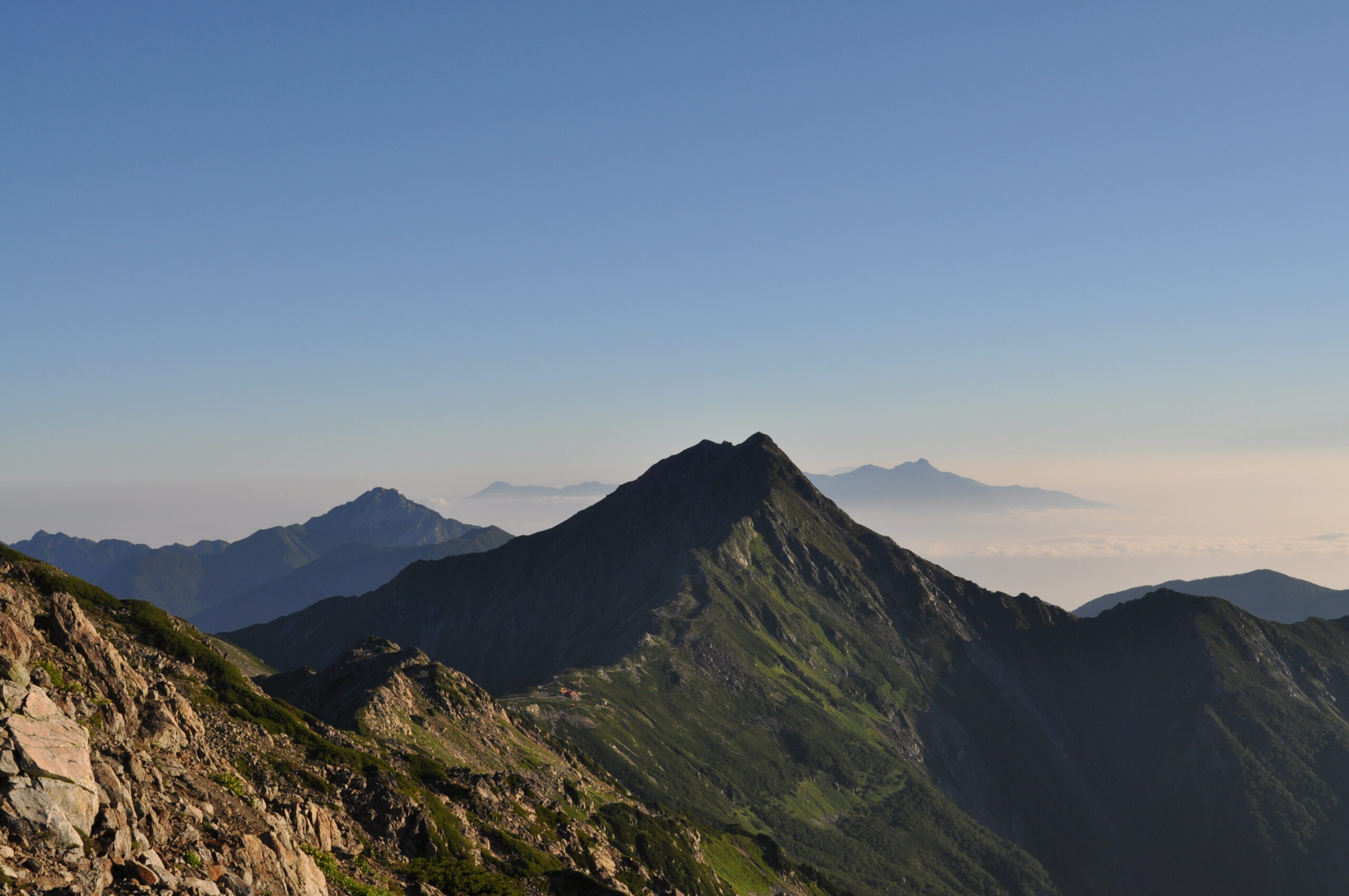 飯豊連峰 飯豊連峰の最高峰は飯豊本山(2105m)ではなく、大日岳(2128m)です。大日岳から飯豊本山を見てみたいです。下の写真は飯豊本山から見た大日岳。