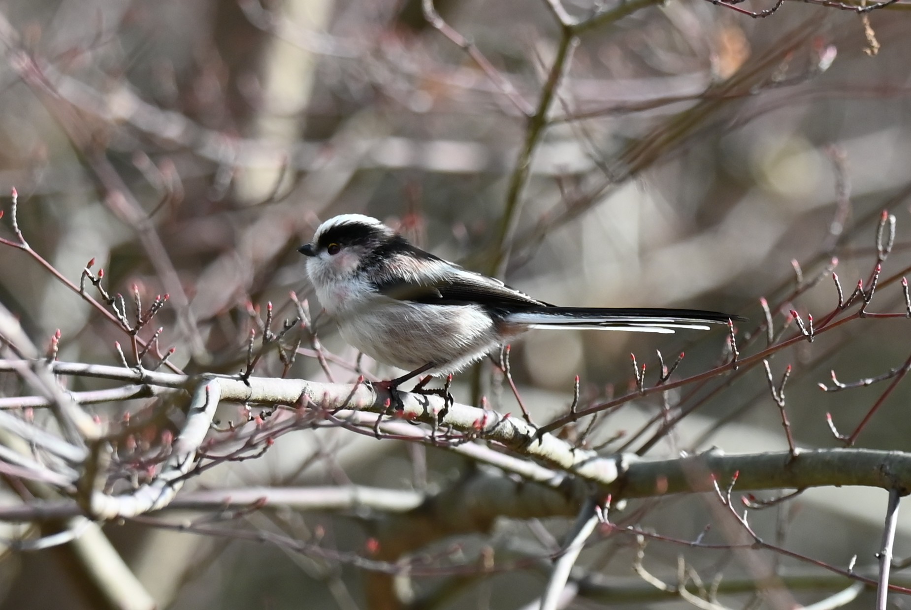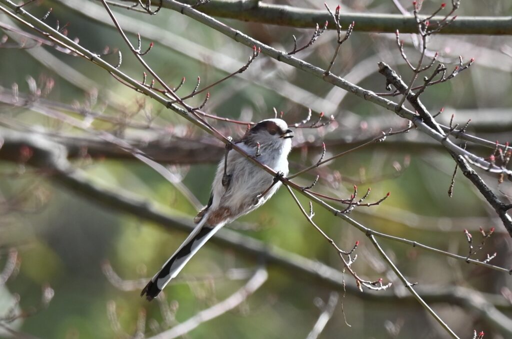 機敏な動きは猛禽類から逃れるための動きだと説明する方もいます。写真を撮るのに最もピントを合せづらい鳥の1つだと思います。エナガはバードウォッチングでよく見かけますが、まともな写真はほとんど撮れてません。この写真を撮るのに苦労しました。シマエナガも同様な動きするのですが、観察しているとある程度動きが読めるそうです。エナガで撮影の練習をすればシマエナガのよい写真が撮れるとのことです。