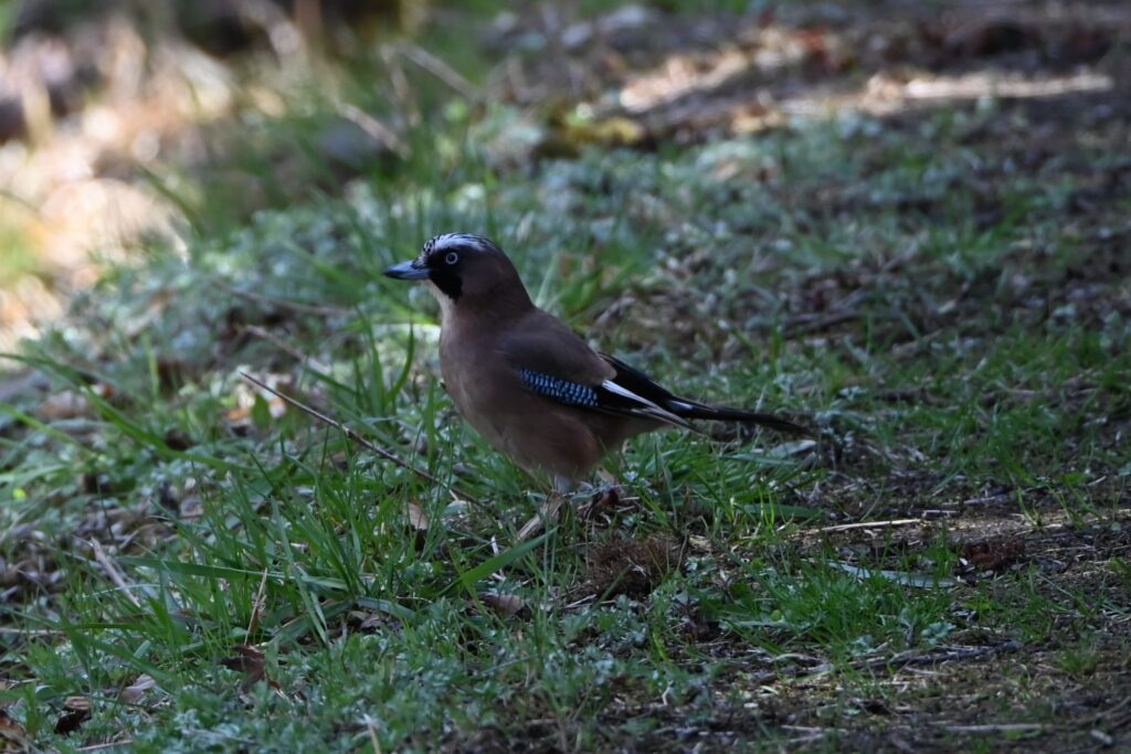 カケス カラス科 留鳥または漂鳥 翼の鮮やかな青い羽根が印象的。雌雄同色で、頭部はごま塩模様、体は赤身のある褐色。ほかの鳥の鳴きまねをする。