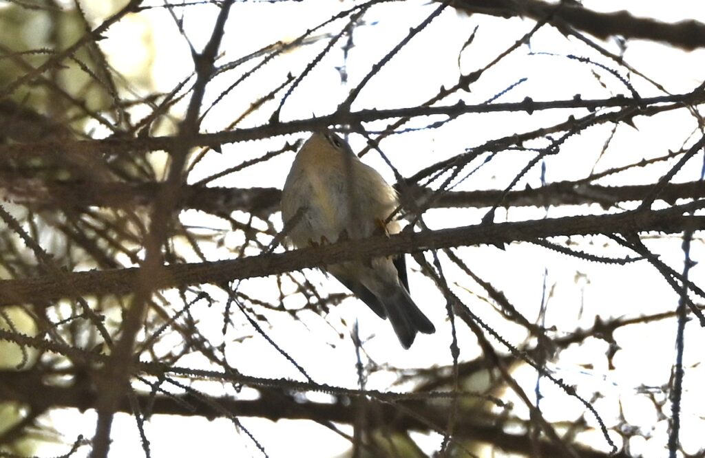 キクイタダキ 森に入った途端、いきなり、木の高いところにヒガラといっしょにキクイタダキが来ているとガイドさんに教えていただきました。群馬県への今冬の飛来数は少ないようで、私は見たことがありませんでした。驚いて夢中で写したのですが、拡大して明るさを加工するとなんとかキクイタダキというのが確認できそうです。ただし、下から撮ったので残念ながらトレードマークの菊の頂は写っていません。(2025年8月に群馬県の亜高山帯で菊の頂を撮影することができました。夏の野鳥8 その他3)