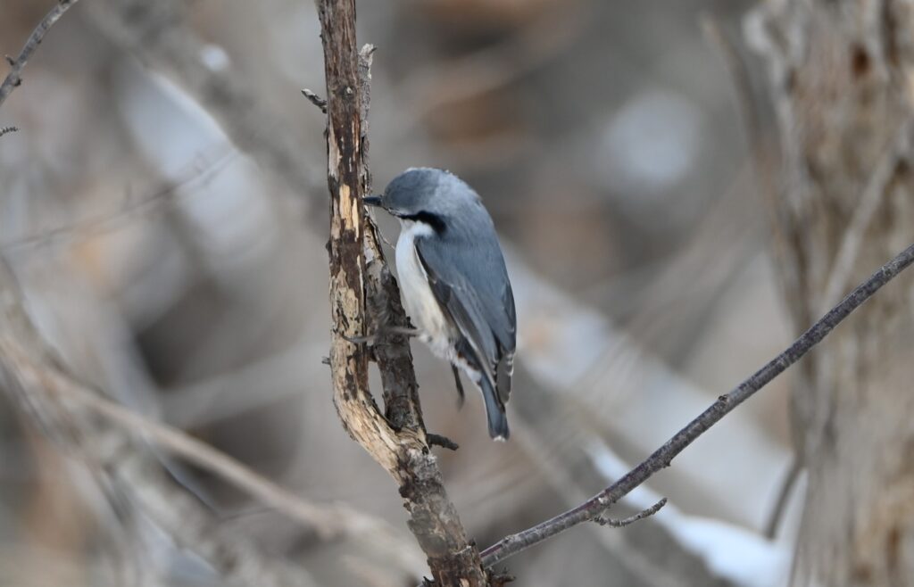 シロハラゴジュウカラ ゴジュウカラ科。ゴジュウカラは頭を下にして幹を逆さまに降りる、器用な動きをする鳥。ゴジュウカラの下尾筒は赤褐色で、「けつ腐れ」という気の毒な異名がある。北海道にいる亜種のシロハラゴジュウカラはその部分が白色である。