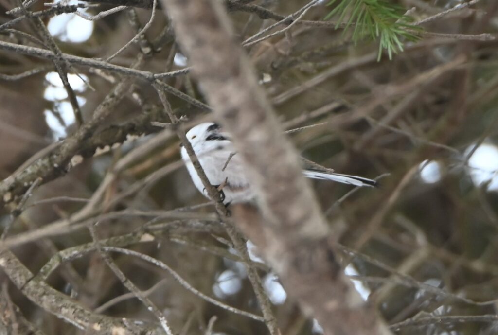 シマエナガ エナガ科。留鳥。エナガの亜種で、エナガにある黒く太い眉斑がなく、頭部は純白。雪の妖精とも言われている。キバシリを写していると、ガイドさんはシマエナガの鳴き声が聞こえてきたと言われ、その通りに、間もなくツガイのシマエナガがやってきました。いつもならすぐに通り過ぎるようですが、この日は遠方から来ている私へのサービスでしょうか、姿を見せてくれていた時間は長かったようです。しかし、まるで忍者のように木々の間を動き回るため、カメラ操作に慣れていない私には良い写真をとることができませんでした。なんとかシマエナガだとわかる写真が1枚だけ撮れました。木々の間を軽業師のように動き回るシマエナガはとても人気があり、バードウォッチングはしないけれど、シマエナガだけを見るためにツアーに参加される方もおられるそうです。エナガ(2枚目の写真で、群馬県で写しました。)との顕著な違いは、黒く太い眉斑があるかないかです。私はエナガも同じくらいに可愛いと思います。どうしてエナガの人気が出ないのかが不思議です。
