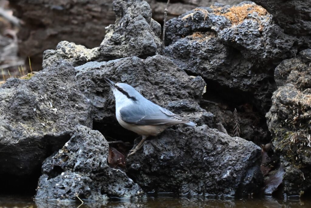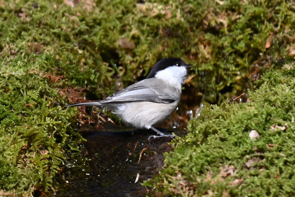 ヒガラ シジュウカラ科。日本のカラ類では最小。喉が黒く、類似のシジュウカラ(冬に低地で見られる小鳥1)の喉から腹までの黒い線をネクタイに対して、本種の喉の部分を蝶ネクタイに例える人もいます。頭に寝ぐせのような冠羽があります。冬はシジュウカラやキクイタダキなどと混群になります。この森ではよく鳴き声が聞こえました。