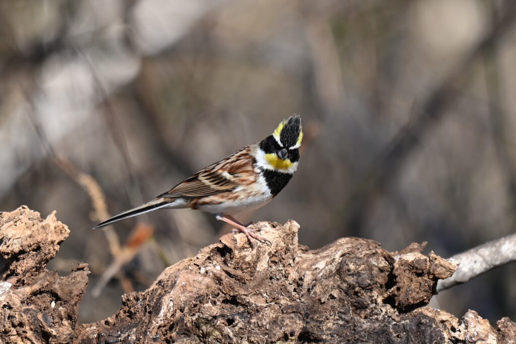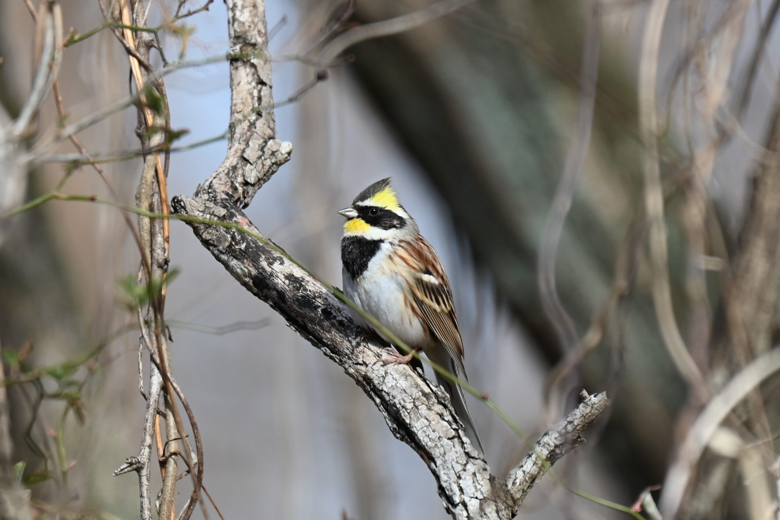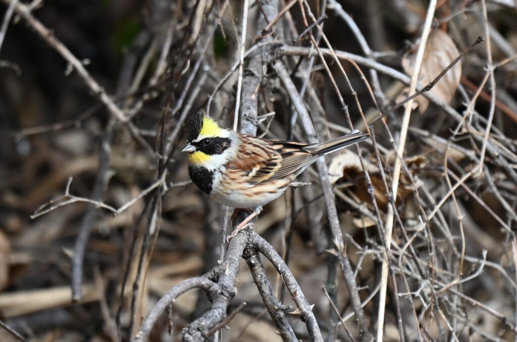 オスの独特の黄色と黒のコントラストが気品と同時にギャングを連想させる悪役感を感じさせます。写真のメスとしている鳥はカシラダカのオスと識別が付きづらいのですが、胸に三角マークがないので、ミヤマホオジロのメスだと考えています。