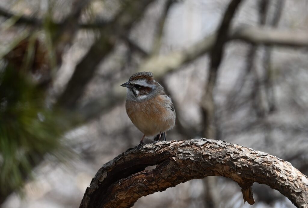 ホオジロ 留鳥。顔が白黒で体はスズメのような色の鳥。和名は頬の一部が白いことに由来するが、そほど目立たない。オスは白い顔に黒い過眼線と顎線があり、メスはオスよりも淡色で顔の線が褐色。