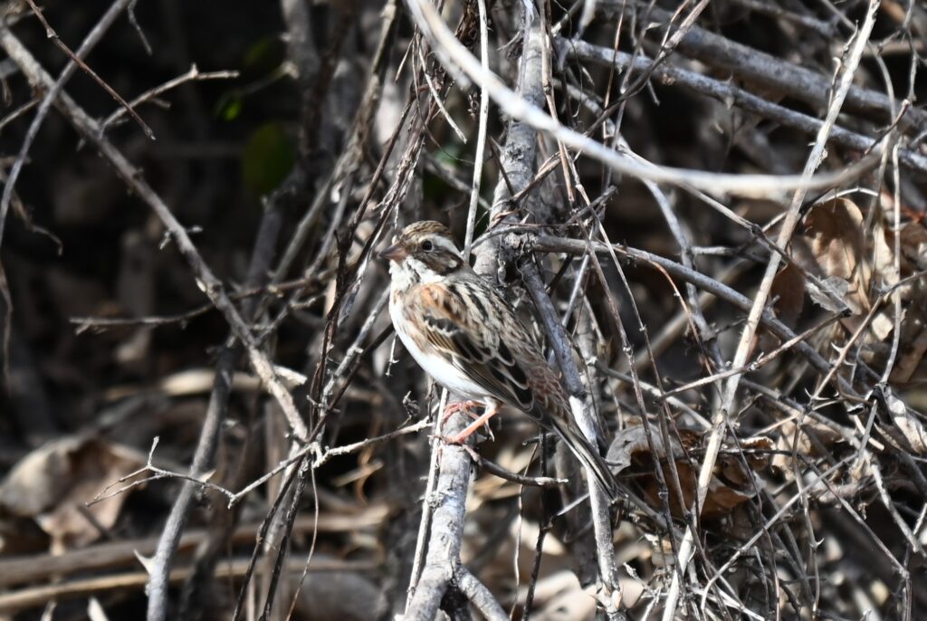 カシラダカ 冬鳥。頭の冠羽が高く見えるのでこの名が付いた。ただ、冠羽はそれほど立ち上がらない。冬鳥として全国に飛来する。体下面は白く、脇に赤褐色の縦斑があるのが特徴。類似種のホオジロの体面下は赤褐色で縦斑がない。冬羽は雌雄同色。近年急に個体数が減少し、世界自然保護連合のレッドリストで絶滅危惧種(危急種VU)に指定されている。減少原因は今のところ不明。