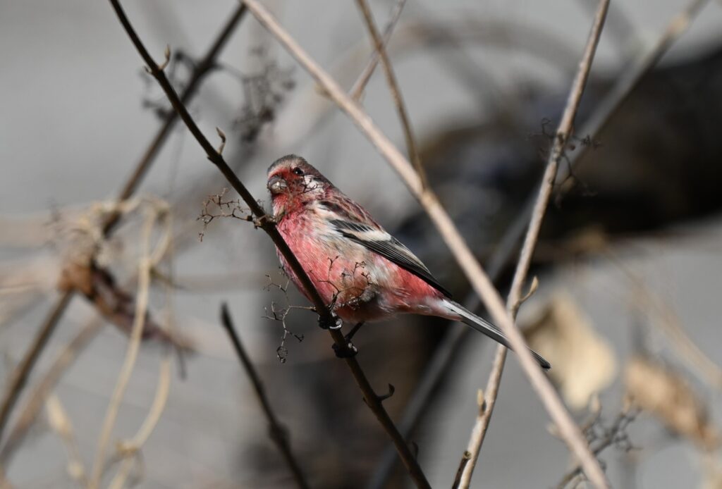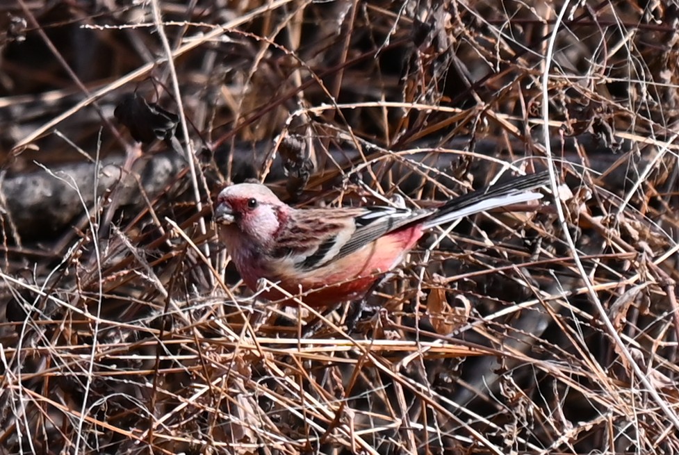 ベニマシコは警戒心が強いと言われています。遠くの藪の中で群れていても、なかなか近くには来てくれません。1枚目と2枚目の写真は同じ個体で、偶然近くの枝に停まったところを写しました。10m位の所です。ルリビタキのオスやミヤマホオジロは人に慣れている個体を撮ったのですが、ベニマシコは野生の個体を撮ったので、ピントの合った写真を見た時の喜びは大きかったです。