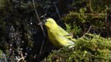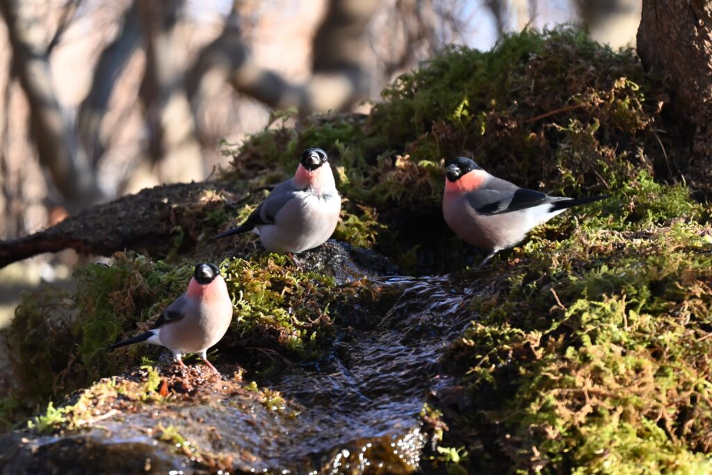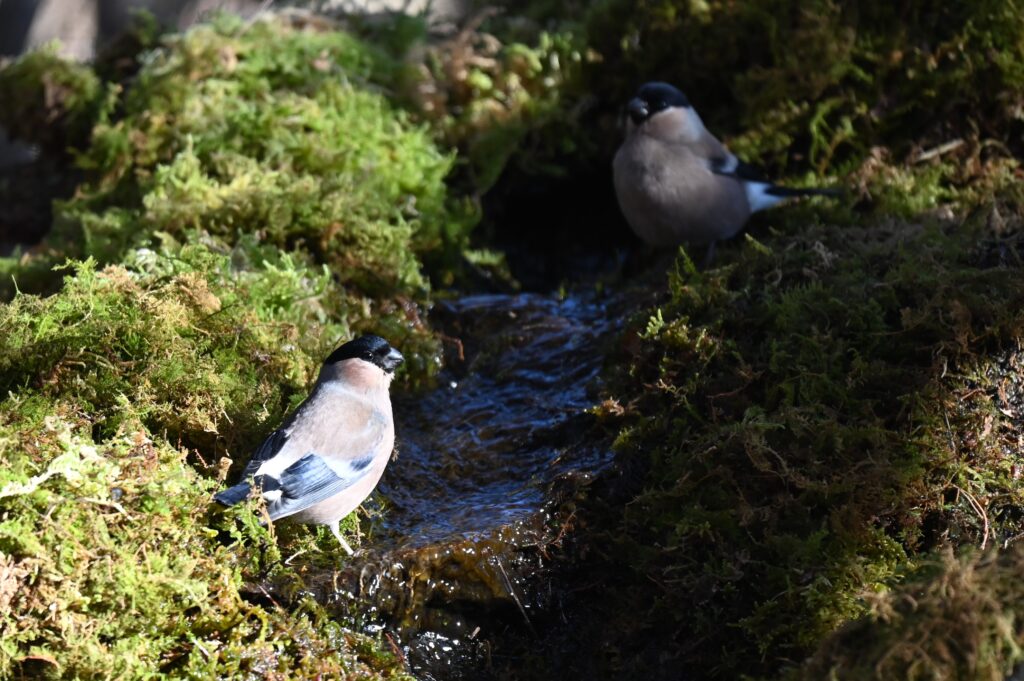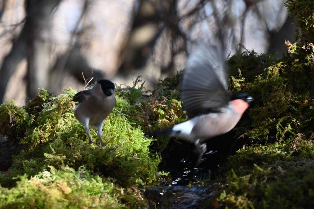 バードウォッチング初心者の私は、この水場で最初にウソのオスを見たとき、ヤマガラだと思って写真を撮らないでいました。すると近くにおられて、帰る支度をされていた常連の方に、ウソが来たと教えていただきました。写真の水場には、オス複数、メス複数で現れることはありましたが、偶然出くわしたオスとメスは追っ払い合い(写真3枚目)をしていました。繁殖期以外は別種と認識するのでしょうか。オスとメスが同時にいるところを写真に撮るのは難しいそうです。夏は亜高山帯で見かけました(夏の野鳥8 その他の科)。