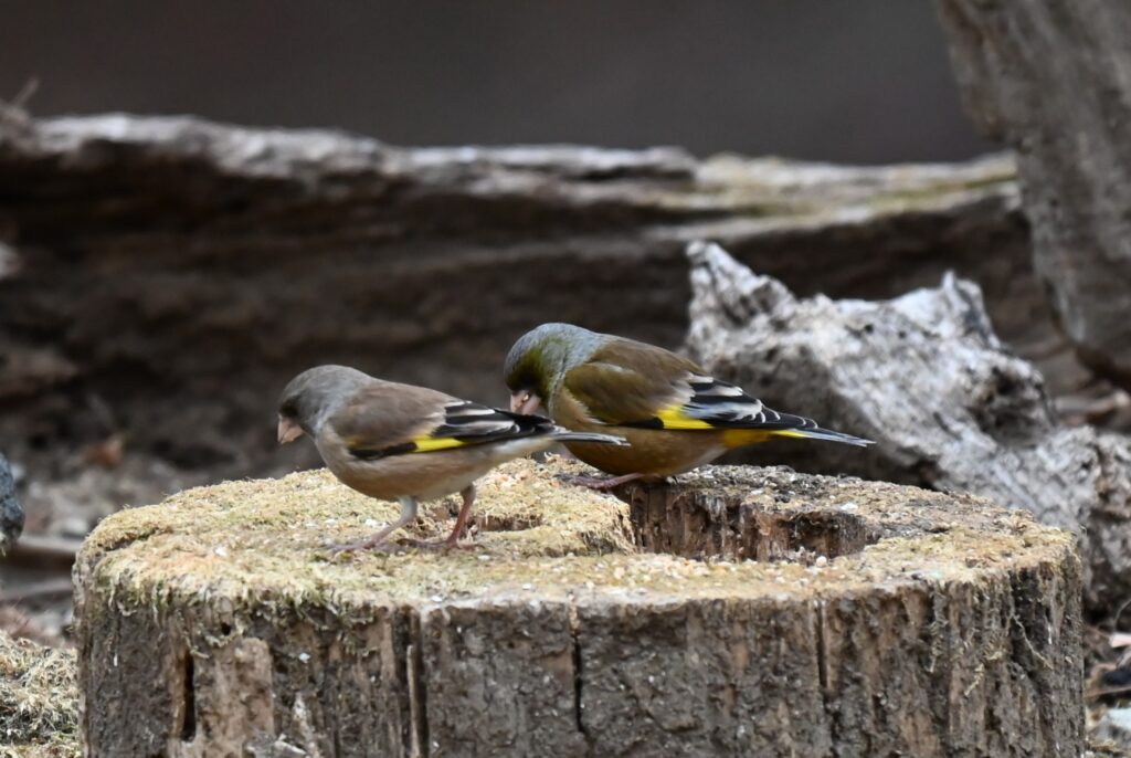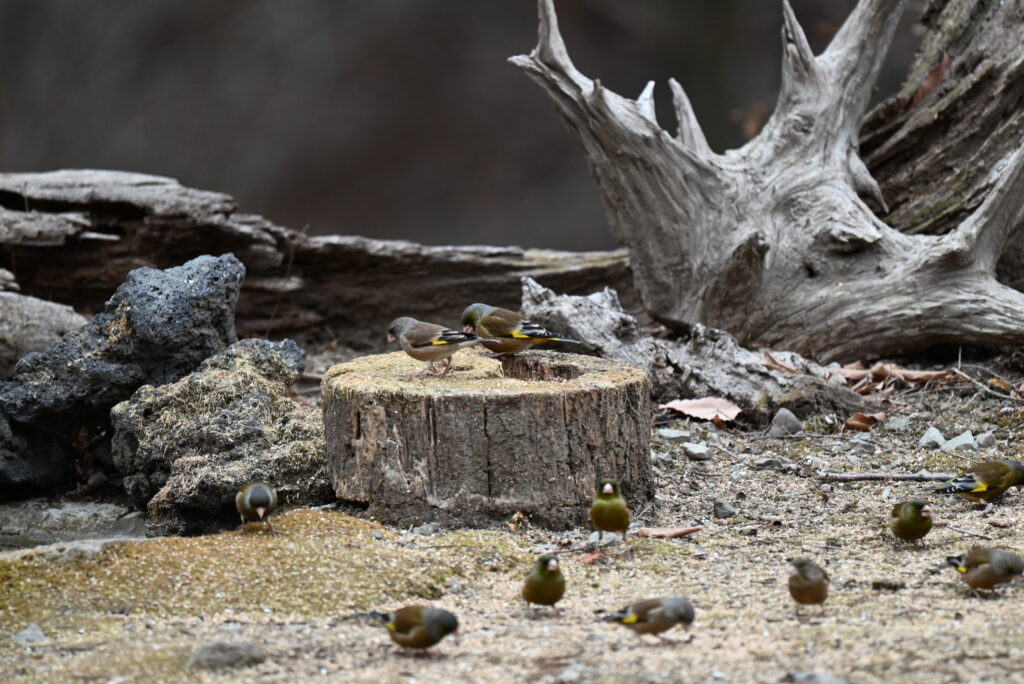 私は1月に2枚目の写真を撮った時、いつものカワラヒワ(1枚目の写真)と少し違うと感じました。両者の違いは微妙ですが、専門家の先生に見ていただいたところ、2枚目の写真には「オオカワラヒワ特徴の三列風きり羽の白班幅がはっきり広く写っています」とご教示いただきました。3月になって、2枚目の写真と同じ場所で、3枚目の写真を撮りました(4枚目は3枚目の拡大)。3枚目の写真ではカワラヒワ群れの中にオオカワラヒワ(切り株の上の奥の方の少し大きい個体)が混じってます。1月に見たオオカワラヒワの個体が、後にカワラヒワの群れと合流した可能性もあります。このオオカワラヒワはカワラヒワと一緒にいると、暖かくなった時に北方へ旅立つことを忘れないのでしょうか。大きなお世話かもしれませんが、少し心配になります。私がもしもこのオオカワラヒワだったら、多分、夏も日本にいると思います。