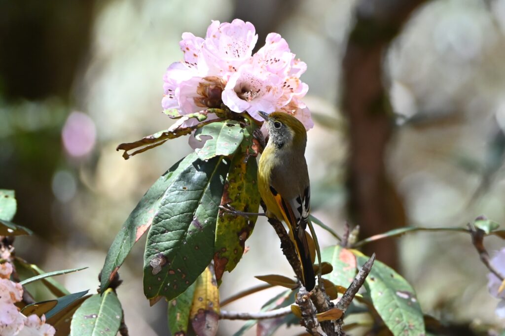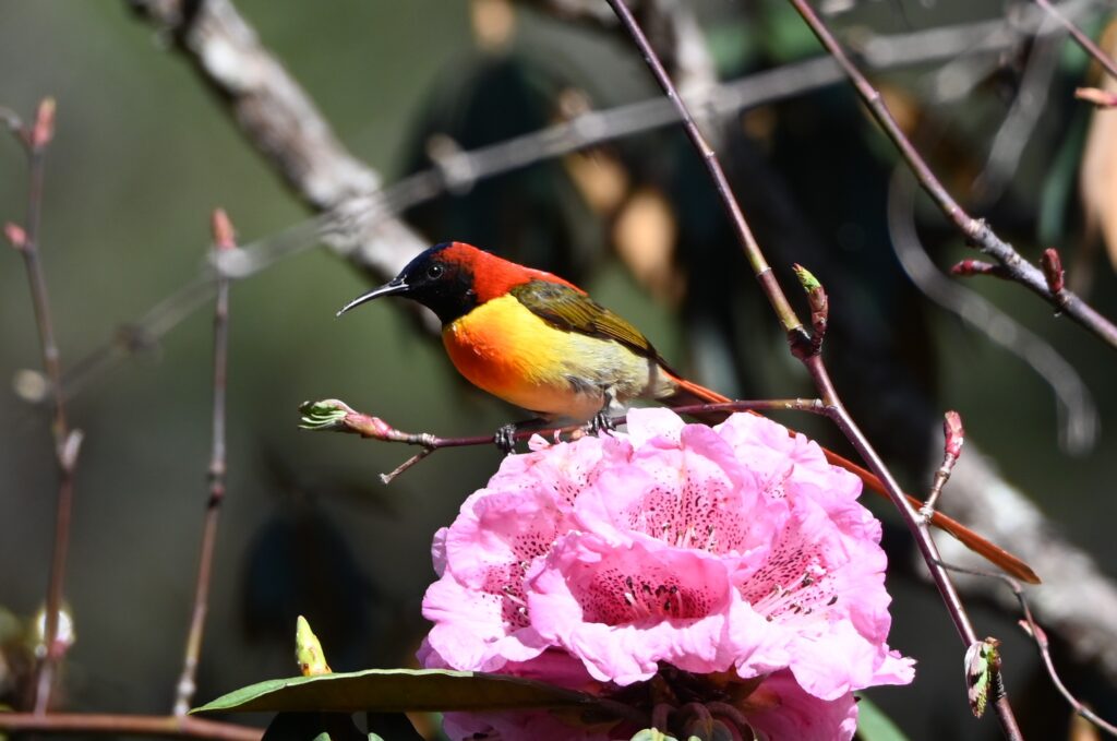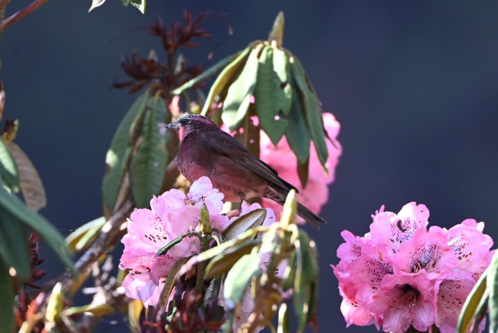 上りはつらい。やっと雪山が見えてきて、ヒマラヤのトレッキングらしくなってきた(下の写真1枚目 ランタン・リルン)。今日は天気が良く、暑いくらいである。グムナチョクを過ぎるとランタン・コーラ左岸に渡り、間もなく急坂が現れた。休みながら登りきると、平らになったところでネパールの国花のシャクナゲがたくさん咲いていて、色鮮やかな野鳥たちが蜜を吸っていた(アカオタイヨウチョウ(2枚目)とバラマユマシコ(3枚目、日本にいるオオマシコに似ている))。こんなに綺麗な野鳥を見ることができるとは予想していなかった。バードウォッチングには良い時期に来たようだ。ちなみに、日本では登山中に多くのシャクナゲを見たが、これまでに鳥が蜜を吸っていたという記憶はない。鳥撮影にかなりの時間を割き、ランタン・コーラを再び渡り右岸に出て、なんとか16時20分にゴラ・タベラ(3020m)に到着した。今日も多くの新しい野鳥に遭遇し、頭の中が混乱している。見る野鳥全てがこれまでに見たことがないものばかりで、これ以上は受け入れられないという状況になってしまった。幸いなことに(?)、これより奥では森林限界となり、遭遇する新しい野鳥が減ってきたのである。