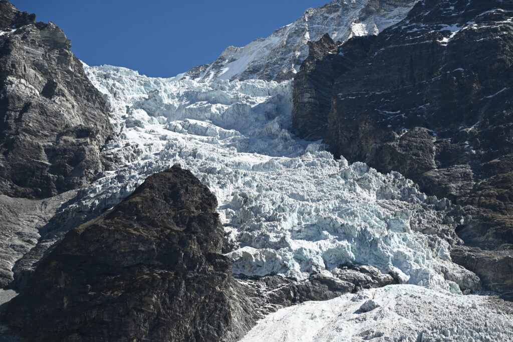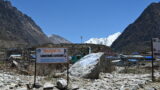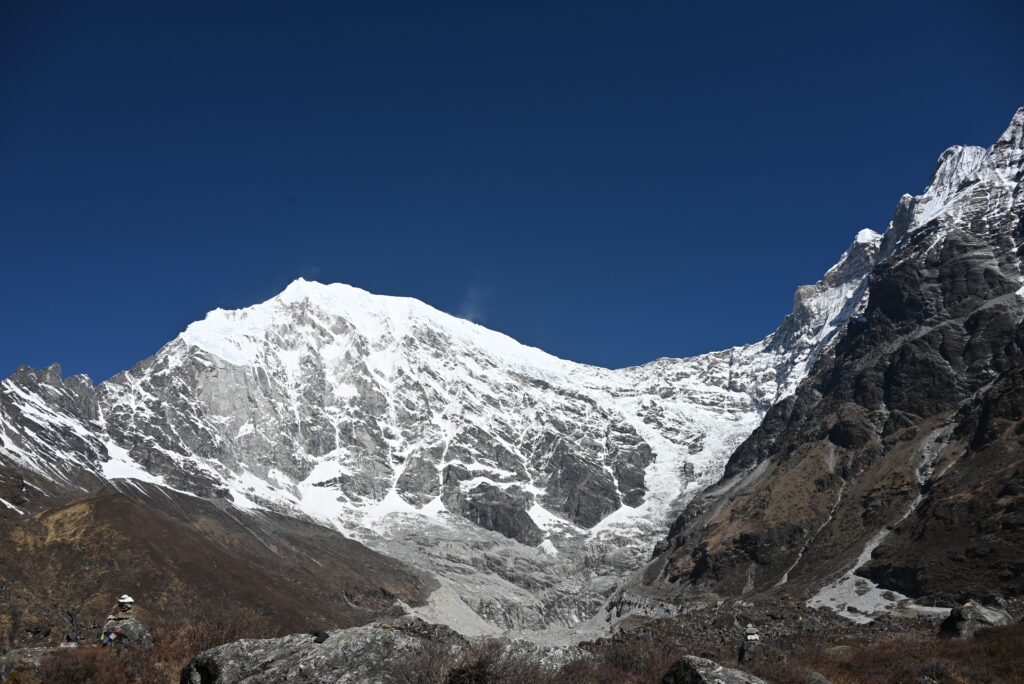 4月24日 昨日はキャンジン・ゴンパに宿泊した。2泊目である。昨日のツェルゴ・リは途中で引き返したので、疲れは残っていない。また、これまでのトレッキングでは高地で咳が出て、体力を消耗したが、今回はほとんど出ない。せっかくヒマラヤの奥地まで来ているので、このまま戻ってはもったいない。ガイドブックに載っている「ランタン・リルンや氷河を眼前に仰ぐコース」に行ってみることにした。キャンジン・リ(私は行っていない)からだとこの辺りは見下ろせそうだが、私が途中まで行ったツェルゴ・リからだと、この辺りは見えなかった。ロッジに聞いてみると、往復で4時間で行くことができ、一本道で迷わないとのことであった。7時20分に出発し、川の左岸を遡る。なだらかな上りであったが、目的地のカルカ(放牧小屋、現在は崩れている)に近づくとジグザクの上りになった。ジグザグ道の標高差は100mくらい。8時50分にカルカに到着。左前方にランタン・リルン(7,227m)とそこを流れているリルン氷河が見える(1枚目)。そして、真正面にはキムシュン氷河が迫っていて(2枚目)、圧倒的な迫力を感じた。動きはないが、氷が河となってゆっくり流れているのだろう。到着した時は誰もおらず、この雄大な景色を30分ほど独り占めにしていた。帰ろうとするとトレッカーとガイドが合計10名足らず上ってきた。このコースにはトレッカーはあまり来ないようだ。