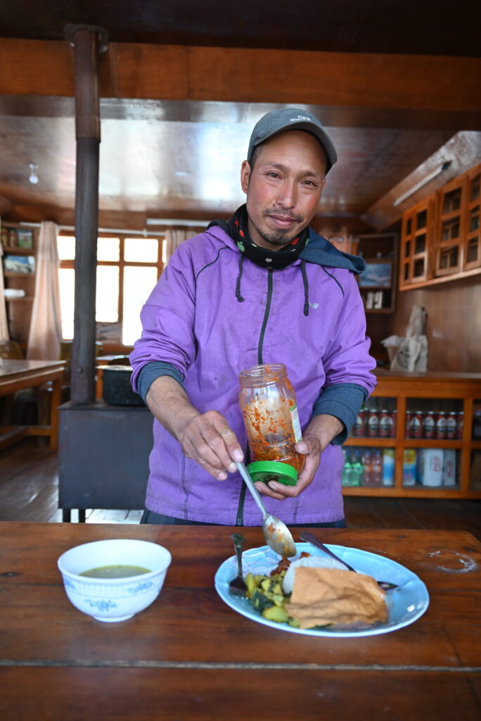 10時半ごろにはキャンジン・ゴンパに戻ってきた。昼食はダルバートにした(3枚目)。ほとんどのトレッカーは携帯で写真を撮っているが、私はミラーレスのカメラを持参している。珍しいのか、ネパール人からは時々写真を撮ってほしいと頼まれた。いつも断るが、この時はロッジの調理担当者だったので、承諾した。ダルバートにアチャールを盛り付けている。スパイスやトマトで味付けされた漬物で、通常ダルバートには付いている。辛いのでこれまでは好んでは食べなかったが、今回は美味しいと感じた。辛いスパイスを食べると肺の機能が向上して風邪をひきにくくなると聞いてから、食べるようにしたのである。今回、咳が酷くならなかったのは、このお陰かもしれない。