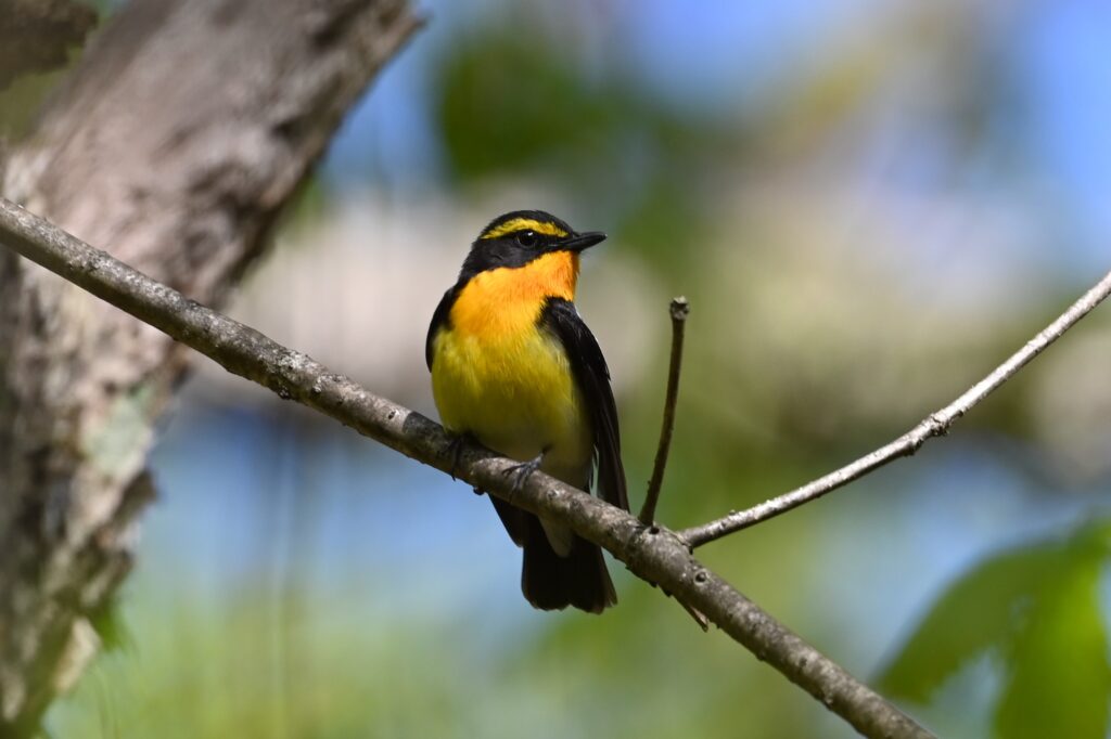 キビタキ 新緑の森で美しくさえずる黄色と黒の鳥。同じ枝に戻らないので、せわしなく動き回る感じ。オスは頭と体上面が黒く、黄色い眉斑がある。翼には目立つ白斑。下面はレモン色で喉は鮮やかな橙色。メスは体上面がオリーブ褐色で、腰と尾羽は茶色。