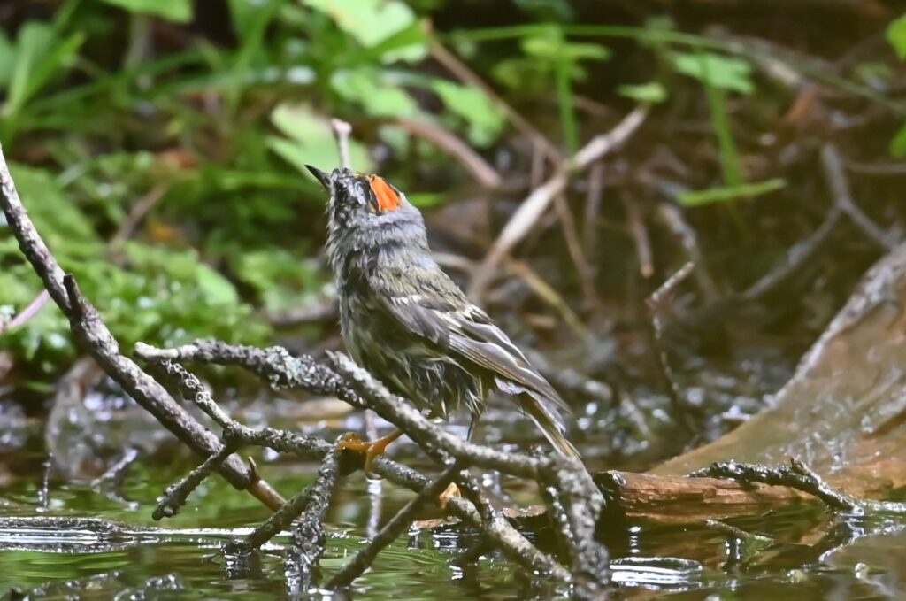 キクイタダキは2025年2月に道東で撮影した(冬の道東で見られた野鳥)のですが、樹上にいたので、トレードマークの頭の「菊の花」は写っていません。キクイタダキと判断したのはガイドさんに教えてもらったからです。下の写真は8月上旬に群馬県の亜高山帯で水浴びに来たところを写しました。ただでさえ、小さいので鮮明な写真は撮りづらいのですが、その上に、動きが素早いです。鳥撮影初心者の私は、三脚を使っていてもほとんどの写真がぶれていました。その中でましなものを選びました。2枚目の写真を日本野鳥の会群馬に見ていただき、「頭部の黄色い部分から、赤い部分が透けて見えているので雄だと思います。」とのコメントをいただきました。キクイタダキを撮った後に、この水場にルリビタキが来ましたが、無意識のうちにキクイタダキと大きさを比べていたのでしょう、アカハラかと思いました。3枚目の写真は別の日に同じ所で撮影したもので、1,2枚目と同じ個体かどうかは不明ですが、赤い部分が見えるのでオスと考えられます。