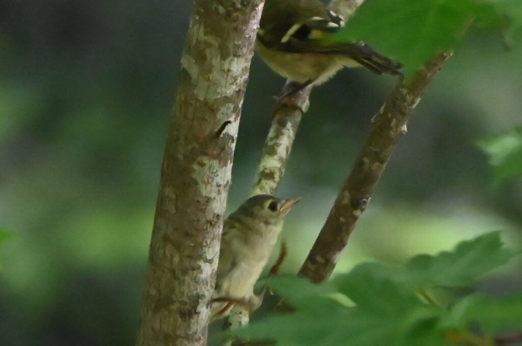下の写真は長野県の妙高山の登山道で8月中旬に写しました。何の鳥かわからなかったので、日本野鳥の会群馬に問い合わせたところ、キクイタダキの幼鳥との回答をいただきました。幼鳥には頭の「菊の花」がないとのことです。この辺りには行きも帰りもキクイタダキの複数の成鳥が飛び回っていたのですが、ぶれたりピントが合わなかったりで、ブログに掲載可能な写真は撮れませんでした。この幼鳥も、奥に写っている野鳥(何であるか不明)がじっとしている間、この枝の下から上までを素早く動移動していました。キクイタダキが野鳥撮影者の間で人気者であるのは、写真が撮りづらいことが一因となっているのかもしれません。