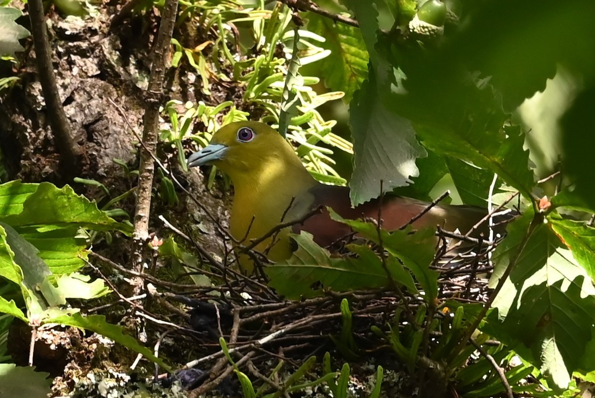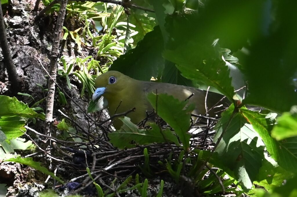 森の中の高い木の枝に営巣していました。8月になると多くの野鳥にはすでに幼鳥が誕生していますが、アオバトの繁殖時期は遅いようで、この巣にはまだヒナは孵っていないようでした。最初はメスが抱卵していました(下の2枚の写真)。オスはそれほど遠くはないところにいるようで、時々声が聞こえていました。