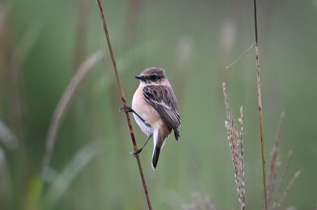 ノビタキ ヒタキ科 夏鳥 夏季に日光戦場ヶ原で夏羽のノビタキのオスを観察しました(2,3枚目 夏の野鳥5 ヒタキ科)が、今回は9月下旬に池之平湿原で冬羽のオスを撮影することができました(1枚目)。オスであることは日本野鳥の会群馬に教えていただきました。ノビタキのオスは夏羽と冬羽ではまるで別の鳥のように違っています。夏は繁殖するので、メスにアピールするために派手な色合いで、冬は外敵から逃れるために地味な色合いなのでしょう。生え変わる過渡期の個体を撮ってみたいものです。