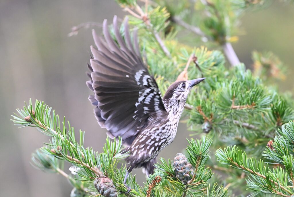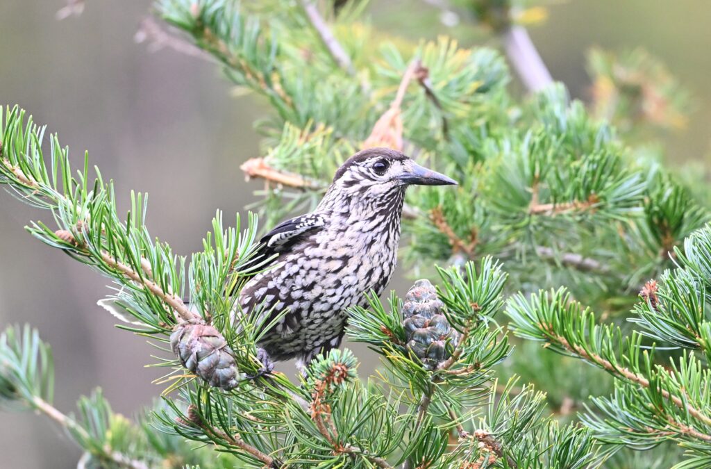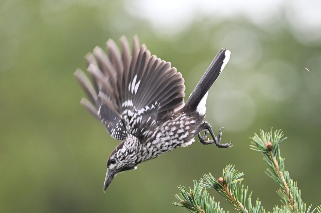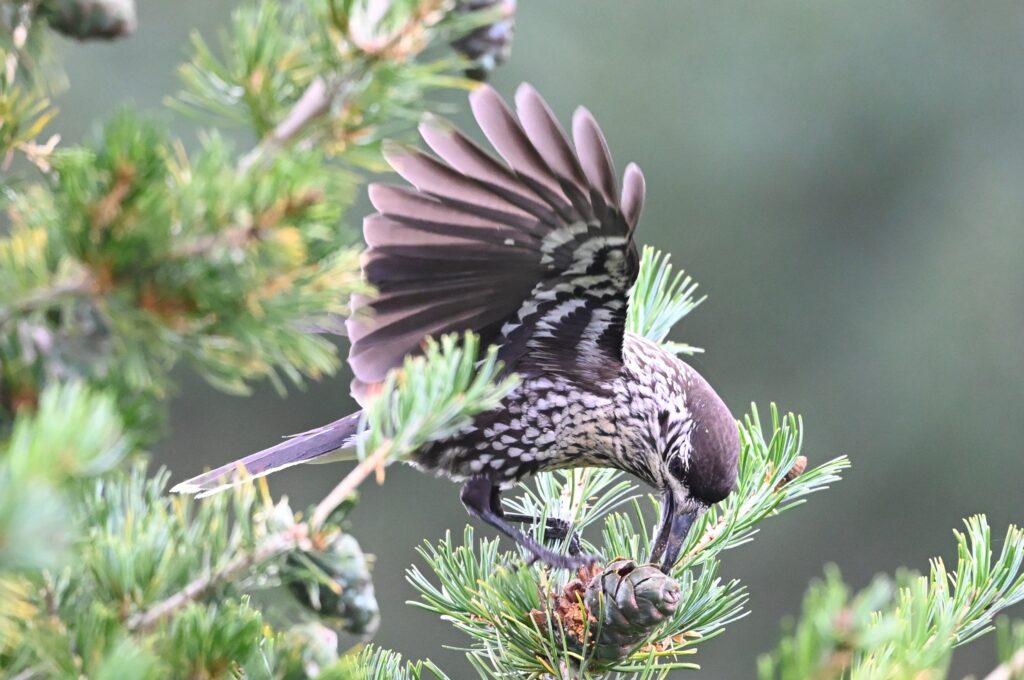 9月下旬に長野県の池之平湿原(標高2,000m)で撮影しました。池之平湿原のホシガラスは松の実を食べに来るとの情報がありましたが、松の木はたくさんあります。この辺にあるのはハイマツではなく、種類は不明ですが、高さ10mくらいの松です。松の木がある区域を2時間ほど行ったり来たりしていました。時々、ホシガラスの鳴き声が聞こえ、飛んでいる姿が見えたので、生息数は少なくないようですが、近くには止まってくれませんでした。ホシガラスは3回連続で空振りだと諦めかけていたところ、運良く、近くの松の木に来てくれました。写真の個体は松の枝間を忙しく飛び回って、実を豪快に食べていました。普段はハシボソガラスのようにガーガーと鳴きますが、松の実を食べているときはハシブトガラスのようにカアーと鳴いていました。まるで私に(近くに私以外の人はいませんでした)自身の存在を誇示しているようにも見えました。ホシガラスはカケスと違って、人が近くにいても逃げない傾向にあるようです。過去の登山中に標準レンズで撮影したことがあります(日本百名山登山中の予期せぬ出来事)が、望遠レンズで撮るのは初めてです。星を散りばめたような白い斑点が美しいです。