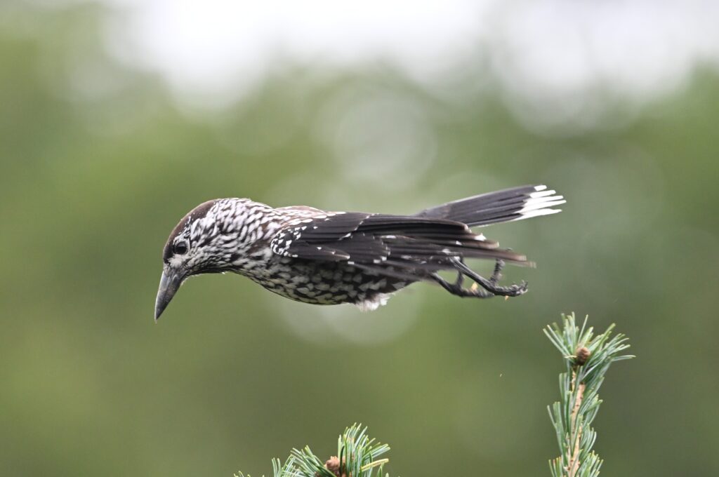 ホシガラス カラス科 留鳥 黒い体に白い星をちりばめたような模様のカラス類。亜高山帯の針葉樹林に営巣し、高山帯のハイマツまで飛んで行って採食する。ハイマツの実が主食で、ハイマツが平地に生える北海道では標高が低い場所でも見られる。冬には低標高地に移動するといわれるが、詳しい動きはまだ判明していない。雌雄同色で、体は褐色の地に白い斑点模様、翼は黒い。下尾筒は純白。