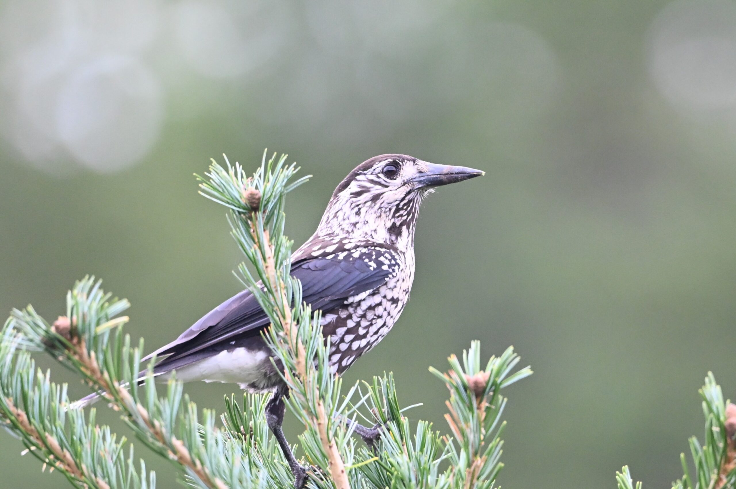 9月下旬に長野県の池之平湿原(標高2,000m)で撮影しました。池之平湿原のホシガラスは松の実を食べに来るとの情報がありましたが、松の木はたくさんあります。この辺にあるのはハイマツではなく、種類は不明ですが、高さ10mくらいの松です。松の木がある区域を2時間ほど行ったり来たりしていました。時々、ホシガラスの鳴き声が聞こえ、飛んでいる姿が見えたので、生息数は少なくないようですが、近くには止まってくれませんでした。ホシガラスは3回連続で空振りだと諦めかけていたところ、運良く、近くの松の木に来てくれました。写真の個体は松の枝間を忙しく飛び回って、実を豪快に食べていました。普段はハシボソガラスのようにガーガーと鳴きますが、松の実を食べているときはハシブトガラスのようにカアーと鳴いていました。まるで私に(近くに私以外の人はいませんでした)自身の存在を誇示しているようにも見えました。ホシガラスはカケスと違って、人が近くにいても逃げない傾向にあるようです。過去の登山中に標準レンズで撮影したことがあります(日本百名山登山中の予期せぬ出来事)が、望遠レンズで撮るのは初めてです。星を散りばめたような白い斑点が美しいです。