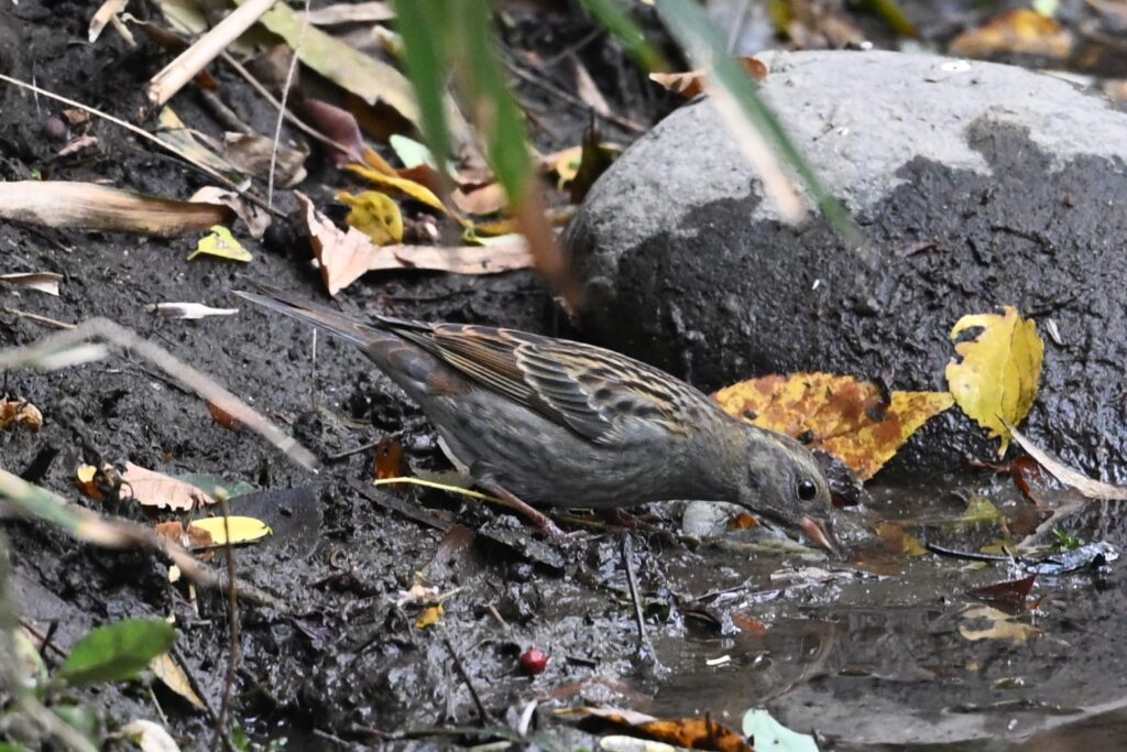 クロジを撮る目的でこの撮影地に来たのですが、1時間半ほど待っても現れませんでした。帰ろうとして三脚からカメラを外したら、種類が特定できない野鳥(黒くなかったのでクロジではないと思いました)が近くに現れました(1、2枚目)。慌てて手持ちで撮影していると、少し遅れてその近くに黒っぽい野鳥(3、4枚目)が出てきて、一瞬ですが並んで水を飲んでいました。最初は別の種類の野鳥が偶然並んだのだと思いましたが、クロジのツガイ(後で出てきた黒っぽい方がオス)だと考えるのが正解のようです。オスが出て来なかったらメスは別の鳥だと判断していたかもしれません。クロジのオスは警戒心が強く、慌てて水を飲むとすぐに飛んでいきました。今回のように、帰ろうとしたときに目当ての野鳥が現れることはしばしばあります。野鳥撮影では帰り時を見極めるのが難しいです。