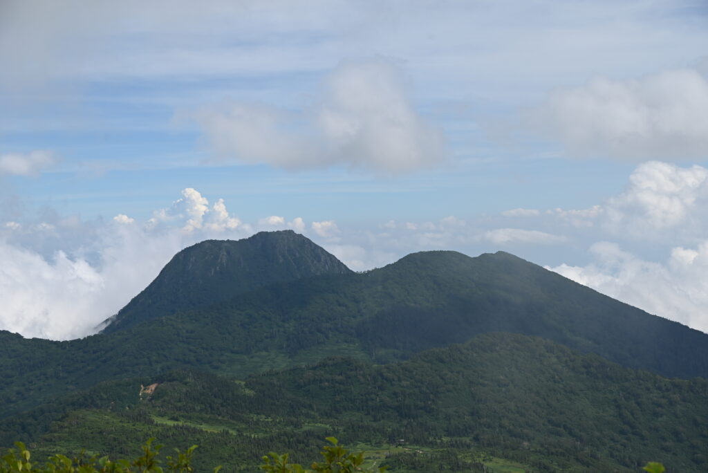 火打山(右)と焼山(左、2022年7月に火打山山頂から焼山山頂への道が通行可能となりました。ただし、上級者向けです。)
