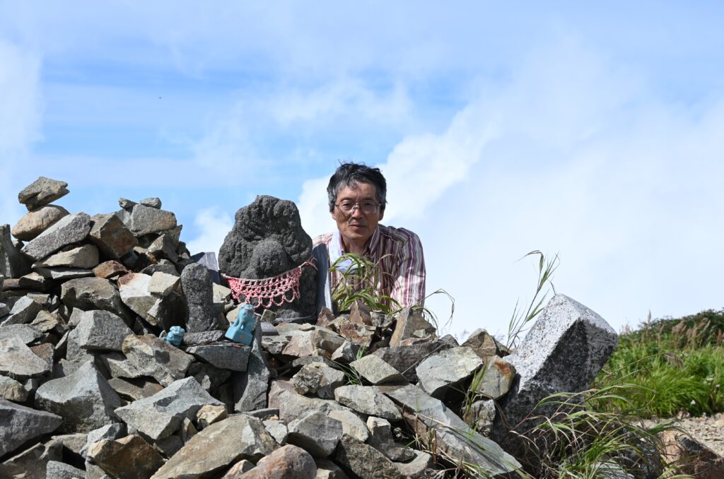 火打山山頂 2025年8月と1984年7月(石像は同じものです。41年前の写真では私の右手近くにあります。)
