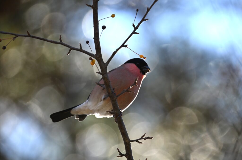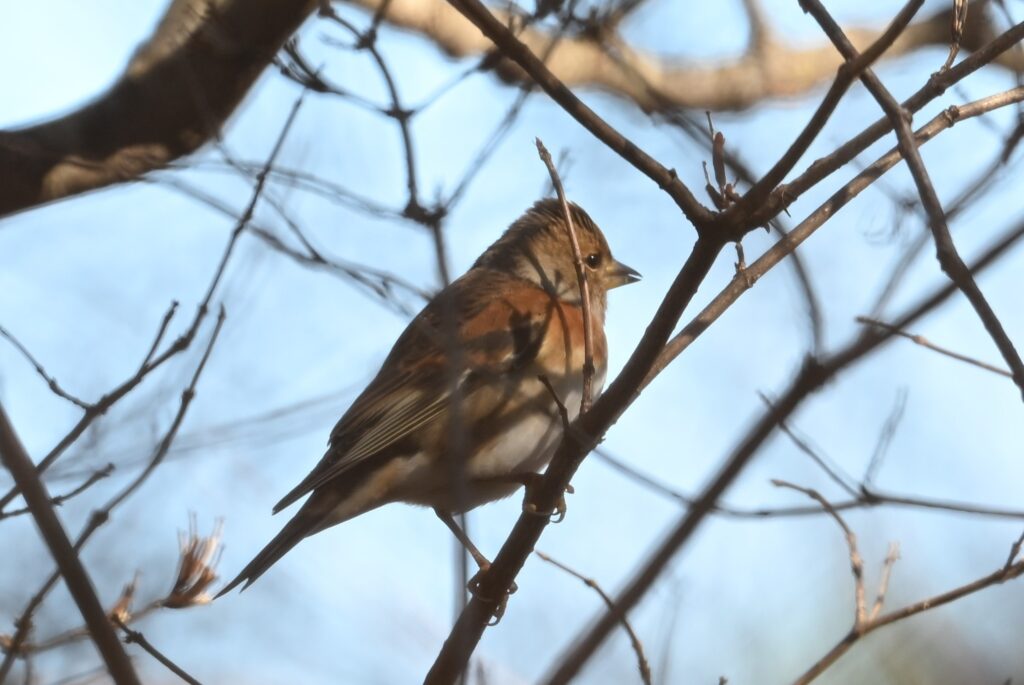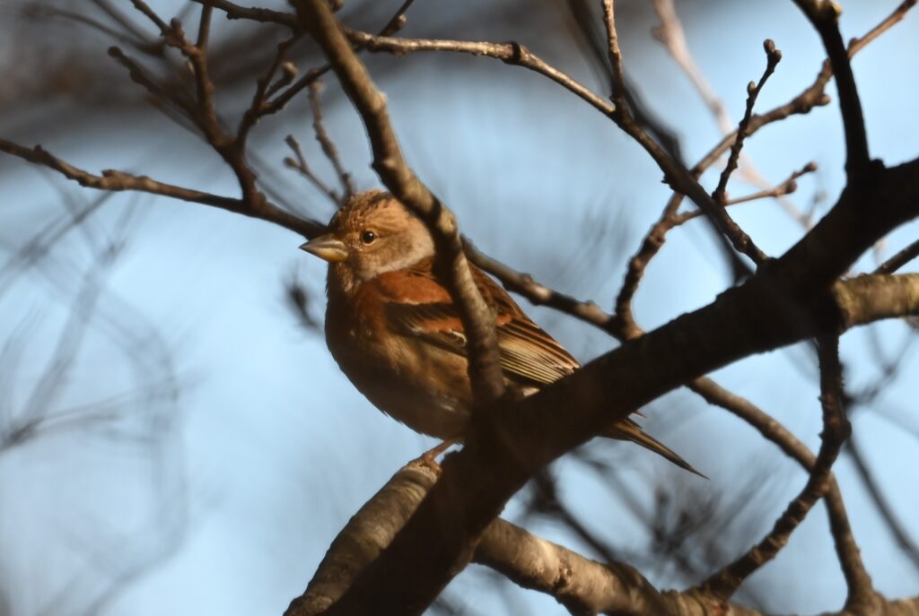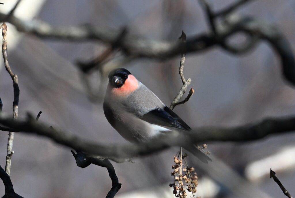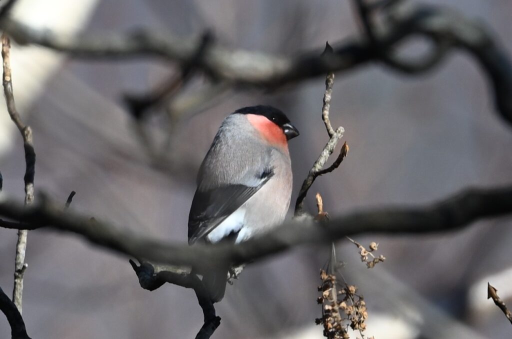 ウソ アトリ科 上記のアカウソ(この時点ではウソだと思っていました)が飛び去ってから10分くらいしてから現れました。同じ個体が戻ってきたのだと思っていました。後でよく見ると腹の色は灰色が強く、こちらはウソで、漂鳥です。今年の8月には標高約2100mでツガイのウソを目撃しましたが、繁殖が終わって標高の低いところに(1500m)降りてきたのでしょうか。ここで越冬するのかもしれません。30~40m位離れたところから写しましたが、前にある枝が邪魔してオートフォーカスは機能せず、マニュアルでやっとピントが合いました。