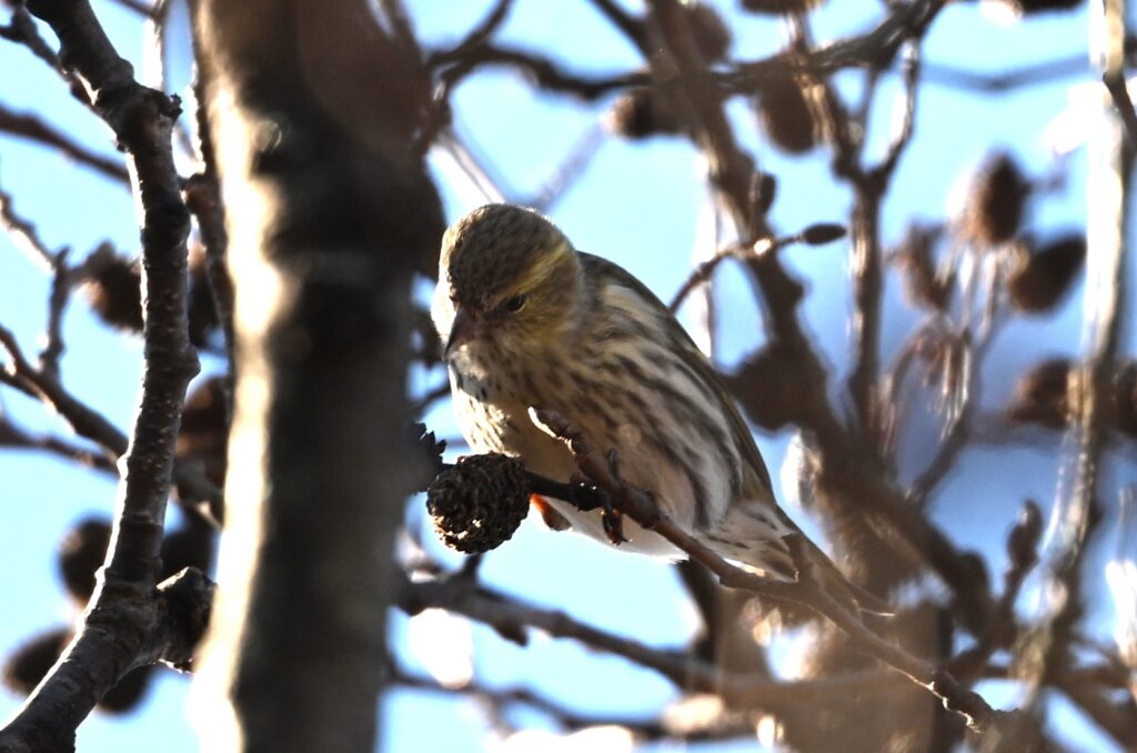 マヒワ アトリ科 写真はメスです。オス(野鳥撮影Nov2025-1)は体全体が黄色です。