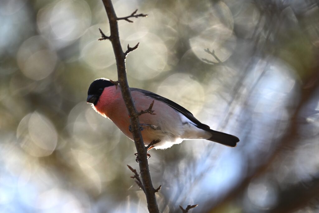 アカウソ アトリ科 この日は登山ではなく野鳥撮影のために来て、1時間ほど定点観測していました。野鳥はアトリとマヒワを撮影することができ、寒いので帰ろうと思っていましたが、「フィフィ」と口笛のような鳴き声が聞こえてきたので、もしかしたらウソかもしれないと思って待っていました。すると鳴き声は本当で、ウソがすぐ近くまで来ました。オスです。この時はウソだと思っていましたが、後で野鳥に詳しい方にアカウソだと教えてもらいました。尾羽下面が白いのが特徴です(次のウソと比べればよくわかります)。冬鳥ですので、体は小さいですが、大陸から渡ってきたのでしょう。