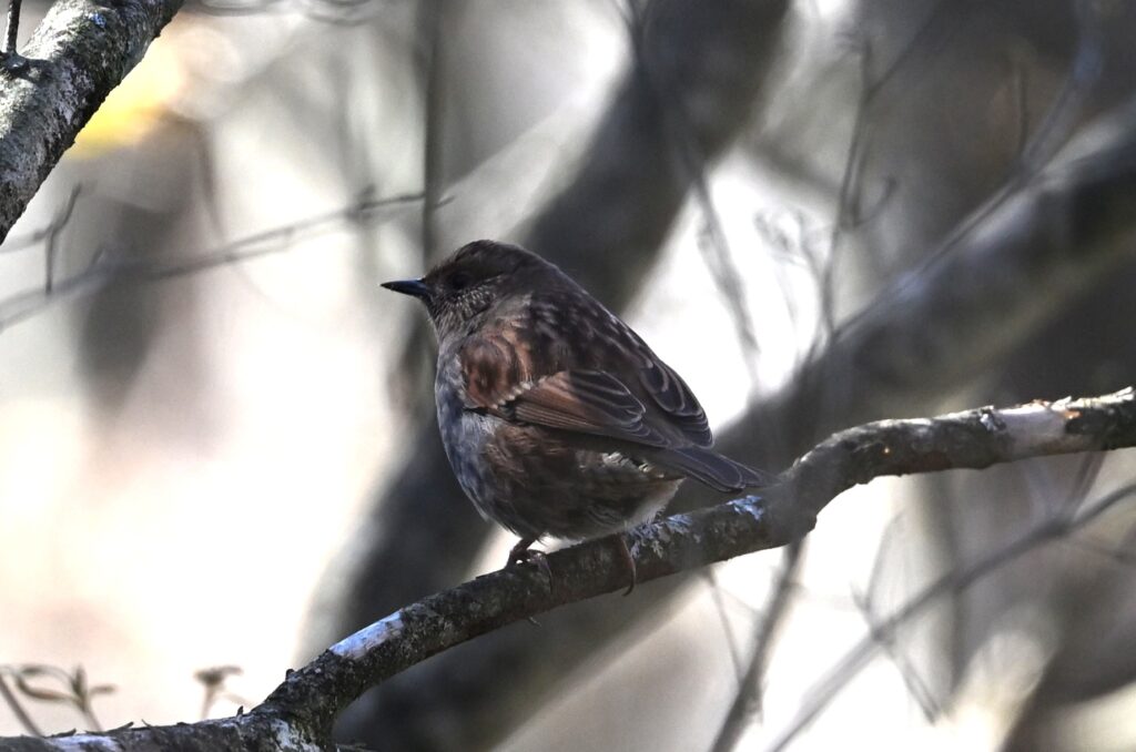 カヤクグリ 漂鳥 7月に標高約3,000m(長野県の北岳)地点で見ました(夏の野鳥7 その他の科2)。ウソと同様に、繁殖が終わって標高の低いところに(1500m)降りてきたようです。ここで越冬するのでしょうか。カヤクグリの名にふさわしく、地面に近いところにいました。この登山道脇は登山者があまり通らないので、居心地がよいのかもしれません。