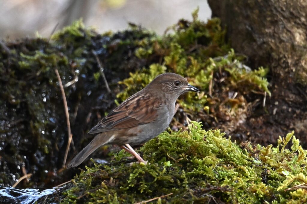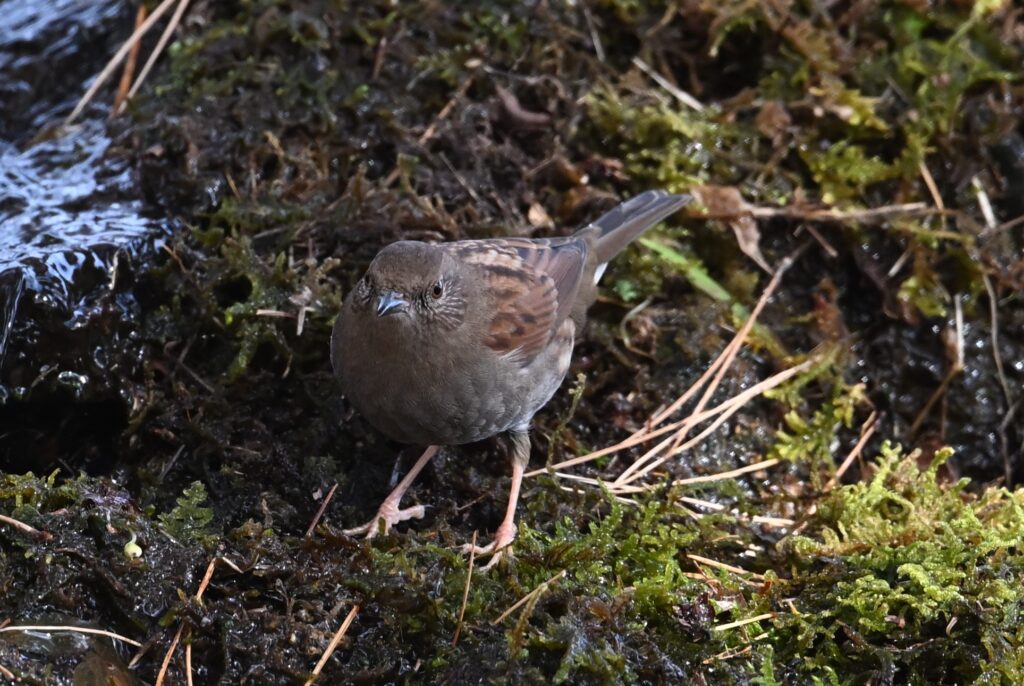 3~4羽の群れで草地にいたので、スズメだと思ってスルーしそうでしたが、カメラのレンズ越しに見るとスズメとは違っていました。夏鳥または漂鳥(この個体は漂鳥)で、前出のカヤクグリと同様に夏季には高山で繁殖します。ネパールの標高約3,500mの所で見かけたヒマラヤイワヒバリ(ネパールトレッキング6-5)にも似ていると思います。