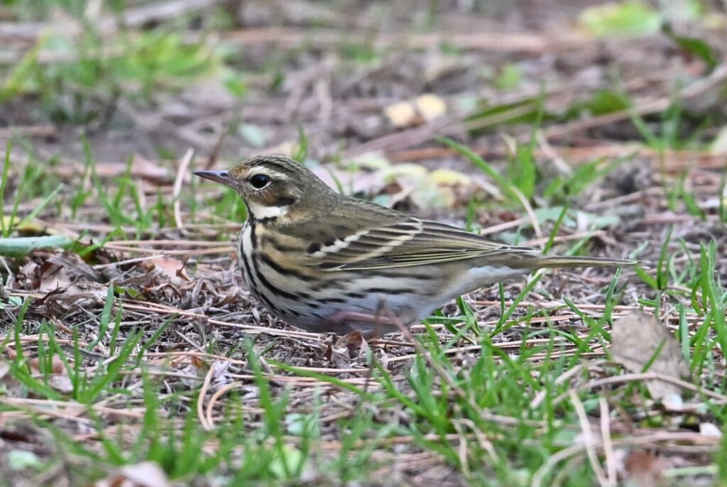 ビンズイ セキレイ科 繁殖期は亜高山帯の針葉樹林などに生息し、オスは梢で、あるいは飛びながらヒバリのような声で囀り、「木ヒバリ」の異名を持つ。冬は平地に移動し、松林の地面にいることが多い。雌雄同色。頭から体上面が緑褐色で、白い眉斑がある。体下面は白地に黒い縦斑がある。耳羽の白斑が特徴で、類似種のタヒバリにはない。