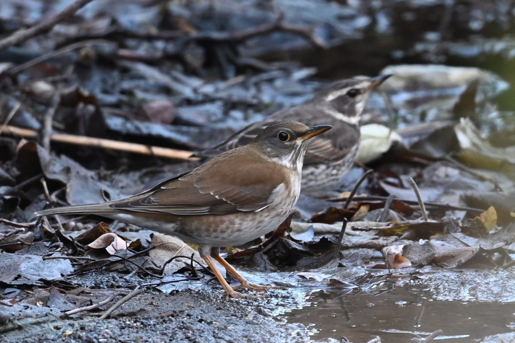 シロハラ ツグミ科 2枚目の写真の奥にいるのは本家?のツグミ(冬鳥)です。ツグミ科どうしなので仲が良いのでしょう。同様に、クロツグミ(夏鳥)とマミチャジナイ(旅鳥)が一緒に行動していたのを目撃したことがあります(野鳥近影Oct2025-1)。また、マミジロ(夏鳥)を過去に2度目撃しましたが、いずれもその後にクロツグミ(夏鳥)(夏の野鳥2 ツグミ科)が現れました。