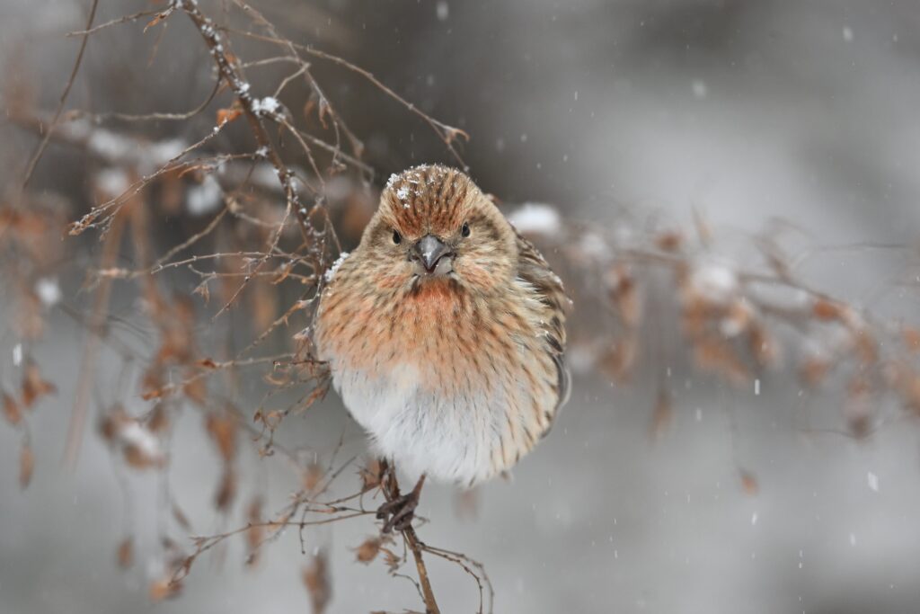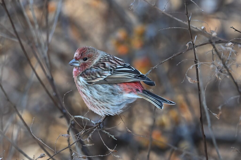 オオマシコ アトリ科 一度は出会いたい赤い鳥。雪上にいるオスはひときわ美しく、ため息が出る。大群になることはなく、数羽で林道脇の地面を歩きながら、落ちている種子を採食する。オスはほぼ全身が赤色で、額と喉が銀色に輝く。メスは全身が褐色で、顔に赤みがある。若いオスはメスに似るが、赤味には個体差がある。