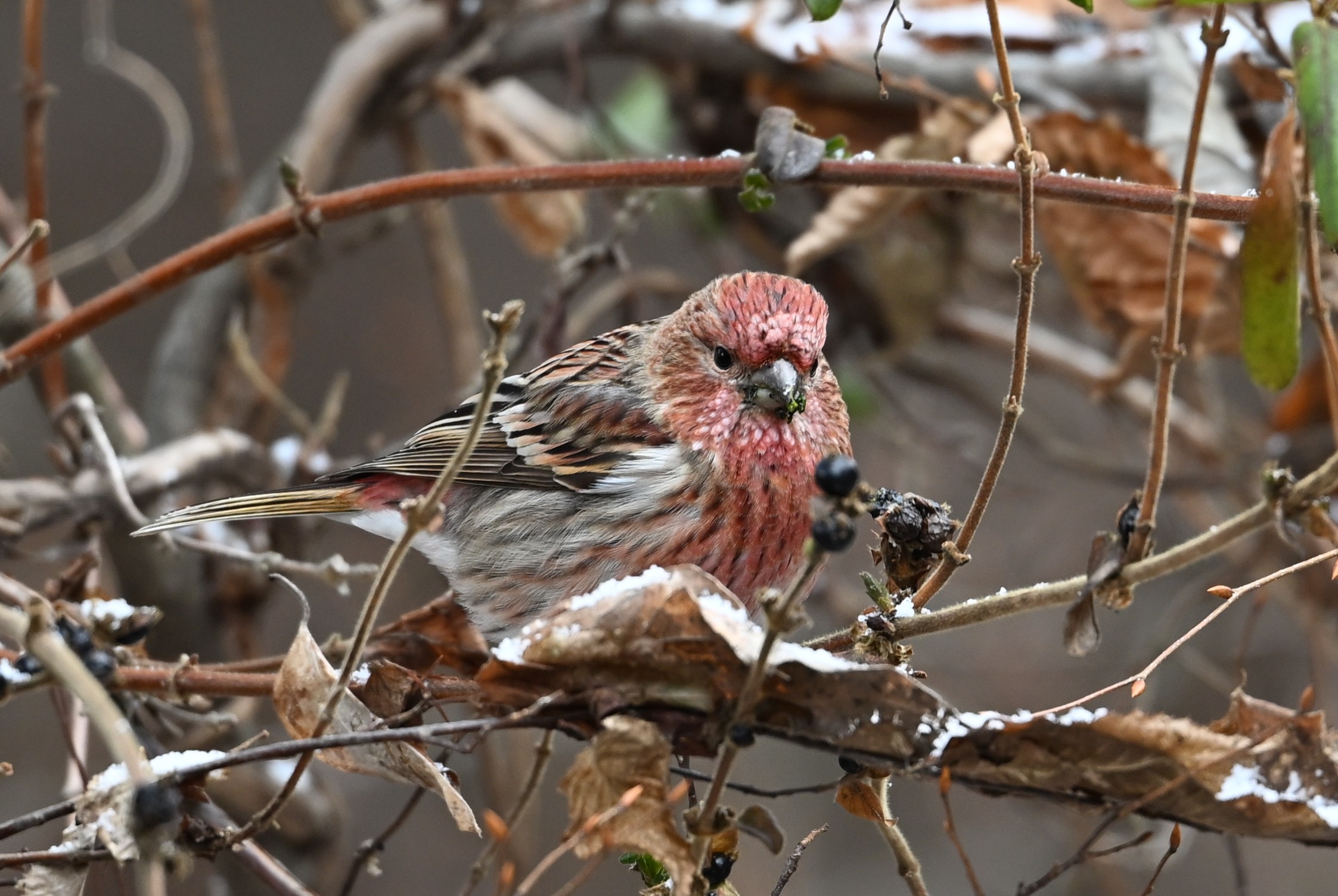 この周辺にはオオマシコの餌となる木の実は豊富なようですが、水場はないのでしょうか。雨がと強くなってくると、アスファルトの道路の継ぎ目の隙間にたまった雨水で水浴びをしていました。こんな狭くて浅いところで水浴びをする野鳥は私の知る限りオオマシコくらいです。