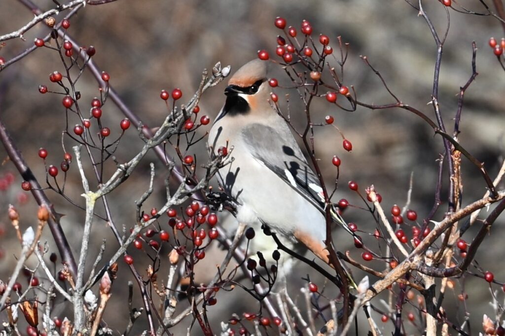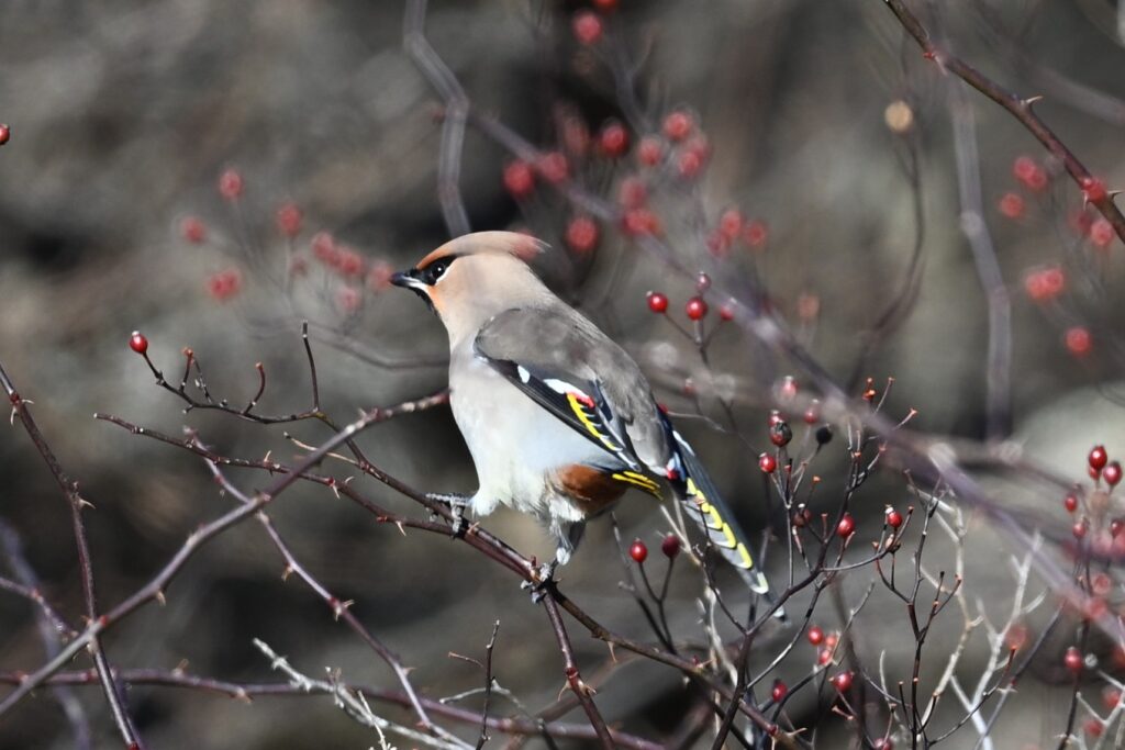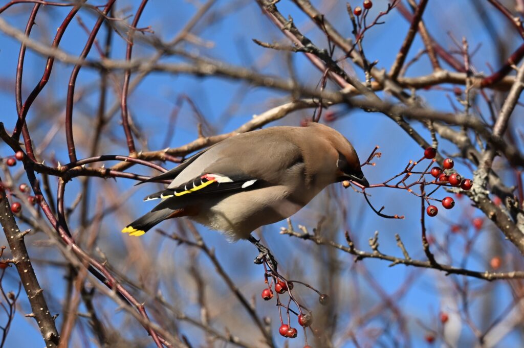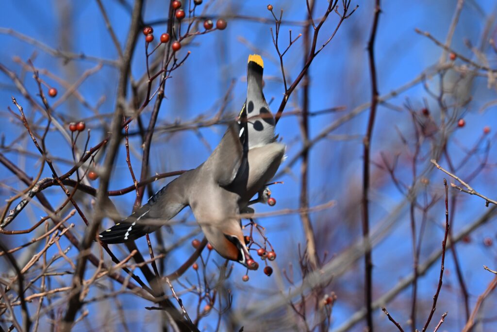 探鳥していると、10羽弱の鳥の群れが20mほど前方の木に止まりました。カメラ越しに確認するとツグミだったのですが、別の個体を見るとレンジャクでした。ツグミとレンジャクは一緒に行動していたようです。レンジャクは他の鳥にはない独特の風貌と気品を備えています。羽毛が絹のように滑らかであることが写真から伝わってきます。このレンジャクは尾羽の先端が黄色いのでキレンジャクです。赤い木の実を全身を使って必死に食べていました(4~6枚目の写真)。警戒心は弱く、10m位のところまで近づくことができました。