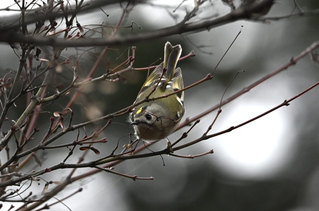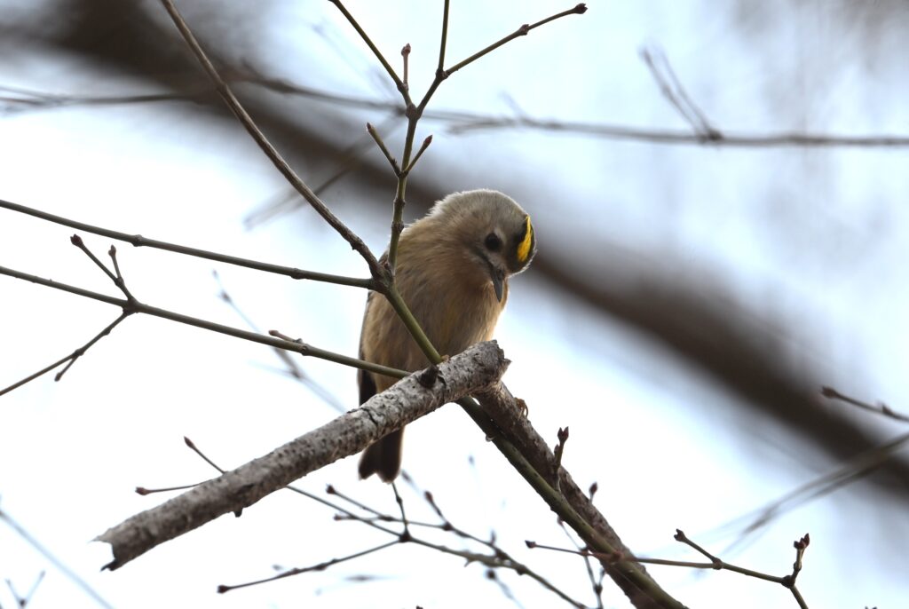キクイタダキ キクイタダキ科 体長は10cmと日本の野鳥の中で最も小さく、そのうえ俊敏な動きをするので、カメラマン泣かせの野鳥です。私は、今年の2月に北海道の小清水町で高所にいるキクイタダキを腹側から撮影しました(冬の道東で見られた野鳥)。また、8月に、群馬県片品村の亜高山帯で水浴びしている姿を撮影し、長野県の妙高山の登山道で行きにも帰りにも群れに遭遇したのですが、成鳥のまともな写真を撮ることはできませんでした(夏の野鳥8 その他の科3)。今回は、前橋市の嶺公園でなんとか、トレードマークである頭部の「菊の花」の部分が写っている姿を撮影することができました。公園内にキクイタダキ狙いのカメラマンがたくさんおられたので、探すのに苦労はしませんでした。3日後に再度嶺公園を訪れましたが、私が撮影した日を最後に、キクイタダキは観察されていないとのことです。