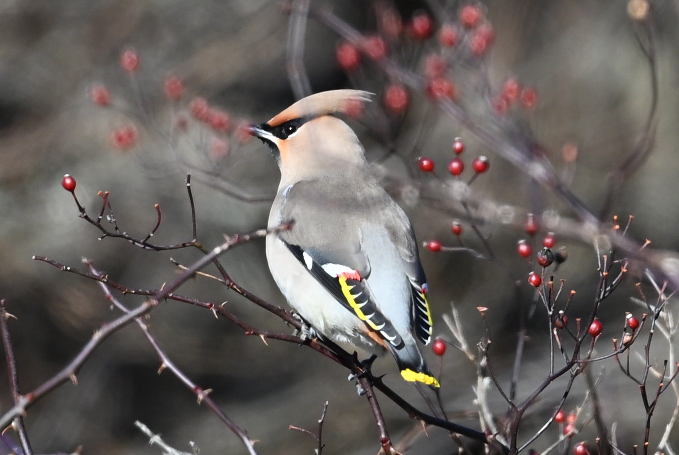 探鳥していると、10羽弱の鳥の群れが20mほど前方の木に止まりました。カメラ越しに確認するとツグミだったのですが、別の個体を見るとレンジャクでした。ツグミとレンジャクは一緒に行動していたようです。レンジャクは他の鳥にはない独特の風貌と気品を備えています。羽毛が絹のように滑らかであることが写真から伝わってきます。このレンジャクは尾羽の先端が黄色いのでキレンジャクです。赤い木の実を全身を使って必死に食べていました(4~6枚目の写真)。警戒心は弱く、10m位のところまで近づくことができました。