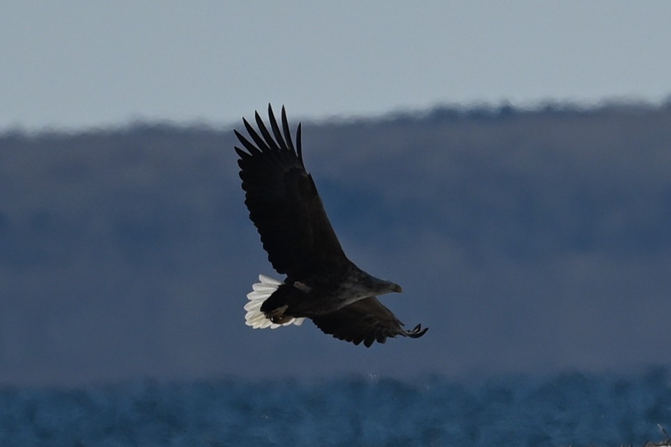 国の天然記念物です。ツガイなのでしょうか、近くにもう1羽いました。冬の道東ではしばしば見られるので、もっとたくさんいると思っていましたが、北海道と本州北部で越冬する個体は700~900羽とのことです。大きくて目立つところにいる(大型の猛禽なので、別の猛禽に襲われることはなく、隠れる必要がないのでしょう)ので、見つけやすいのだと思います。白い尾を広げて飛ぶ姿は美しいです。